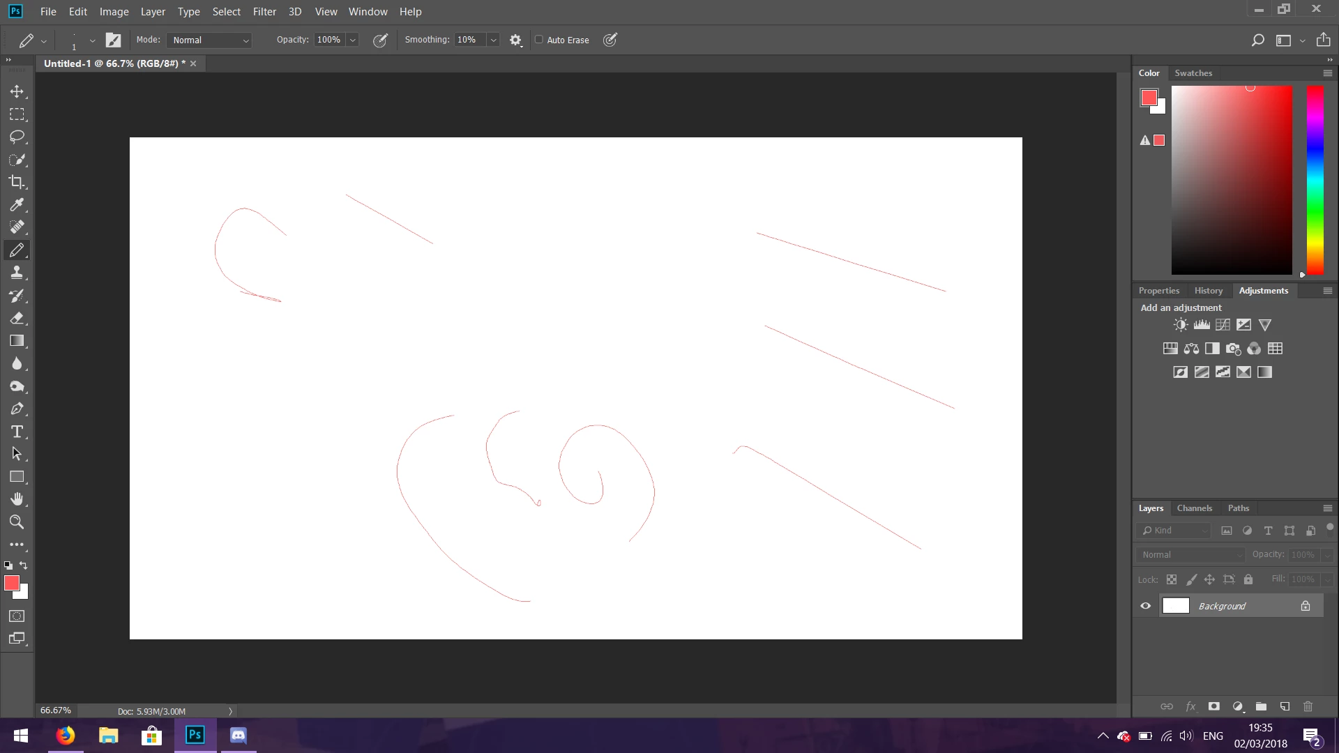 I recently did a hard reset on my Windows 10 laptop computer, and upon reinstalling Photoshop 2018 found a lot of problems arising. The Photoshop workspace is all pushed together and the brushes don't follow the cursor on my laptop screen. When I try to use a brush, it shoots away from my cursor in a diagonal line and doesn't follow. I have also found that the cursor flickers between the typical pointed arrow and a pointed arrow with eggtimer when sitting still.