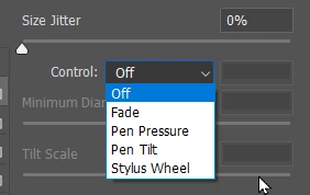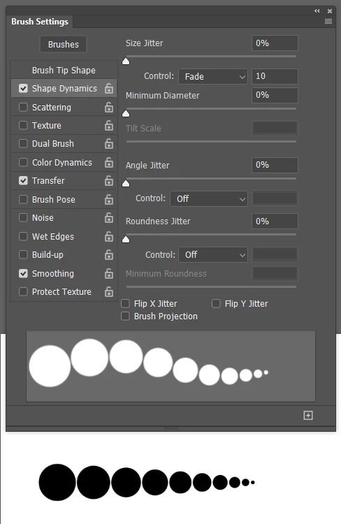 Fade is a favourite of mine. Note that the value applies to each stamp of the brush, so with a value of 10, as per my example. The brush goes from full size to nothing in ten stamps of the brush.