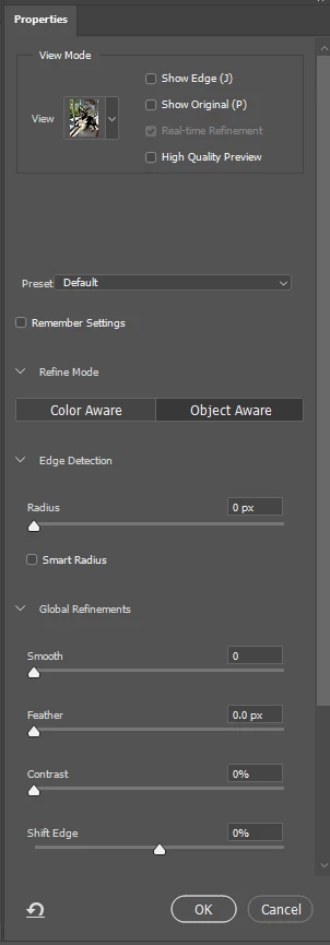 6. The Select and Mask Workspace has these settings shown below (I've tried many many variants but these are the defaults).