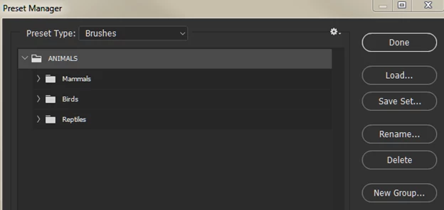 1)  I want to create a new group folder, name it Reptiles, and move three existing species sets into it.  How do I proceed so the group I set up is permanent and Reptiles appears in the Brushes flyout menu the next time I open Ps?