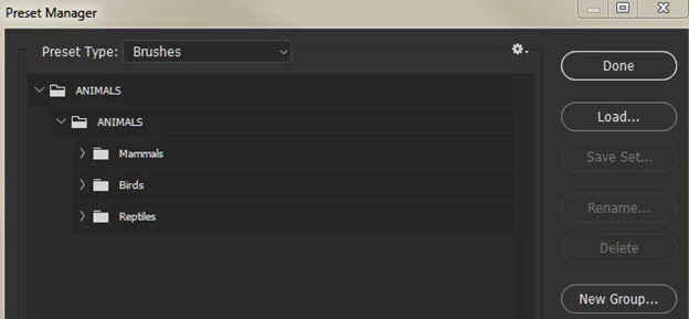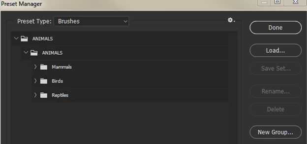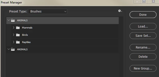 Three brush sets moved into a new group and the ANIMALS group saved.