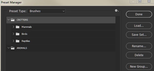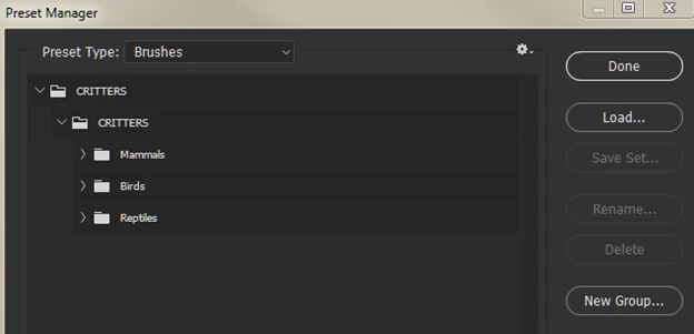 and manually deleting the ANIMALS ABR file.  Then closing the groups in the Preset Manager menu and reloading CRITTERS. But, once again, Ps has created an intermediary group--