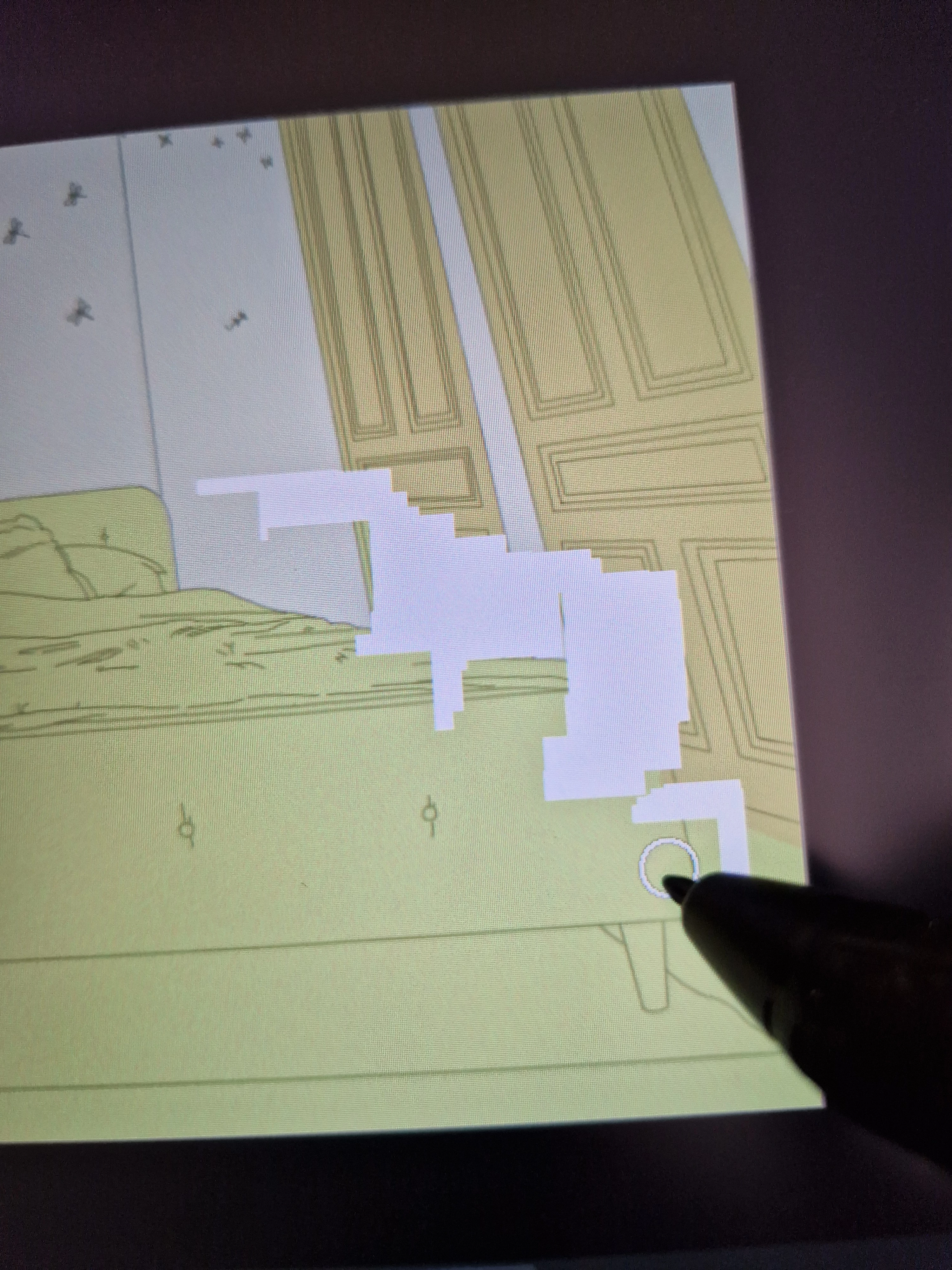 La première image est la zone de dessin que je veux travailler. La deuxième est la zone après utilisation de la gomme dessus sans que j'ai relevé mon stylet. Et la 3ème est l'apparence de la zone une fois le stylet relevé.