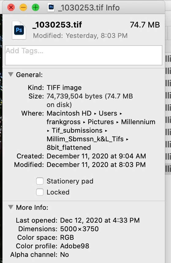 For some unknown reason which hasn't happened before, I am having a little difficulty understanding & calculating file size while preparing 8bit Tif files to fall within the 50 to 60mb range.
