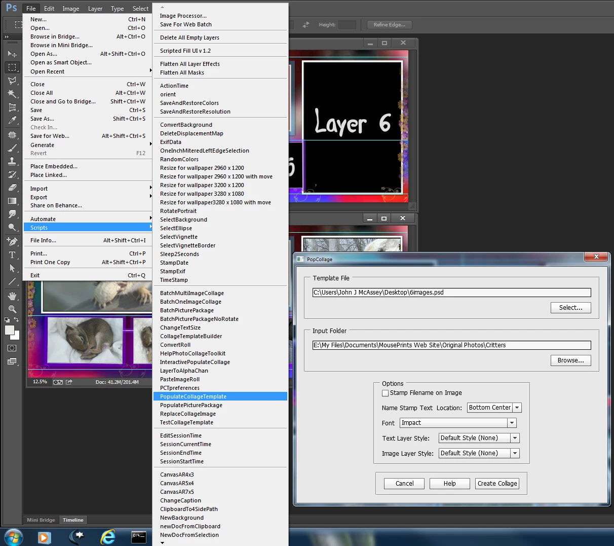 I only used a Background layer.  I did not add and upper overlay layer however the alpha channel I created for image 6 will let some of the background show through image 6.  Here is a screen capture with the Template in Photoshop and under it a populated version. Also just copy my scripts into Photoshop folder Presets\scripts and use them from Photoshop  menu File>Scripts>My Script Selected. The extendedscript toolkit has problems with some things.