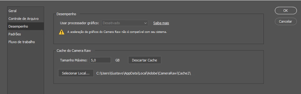 meu photoshop não deixa eu usar o camera raw pois ele diz que a aceleração grafica não é compativel com meu sistema e não me da a opçãp de trocar, aparece "desativado", como resolver?