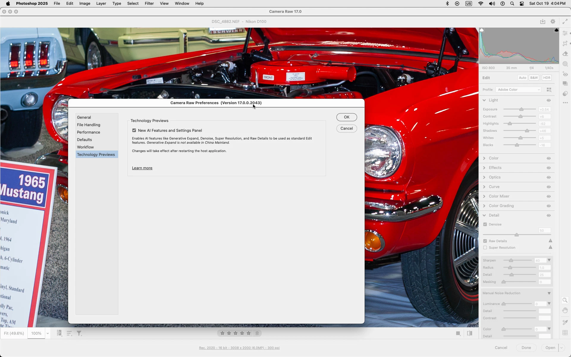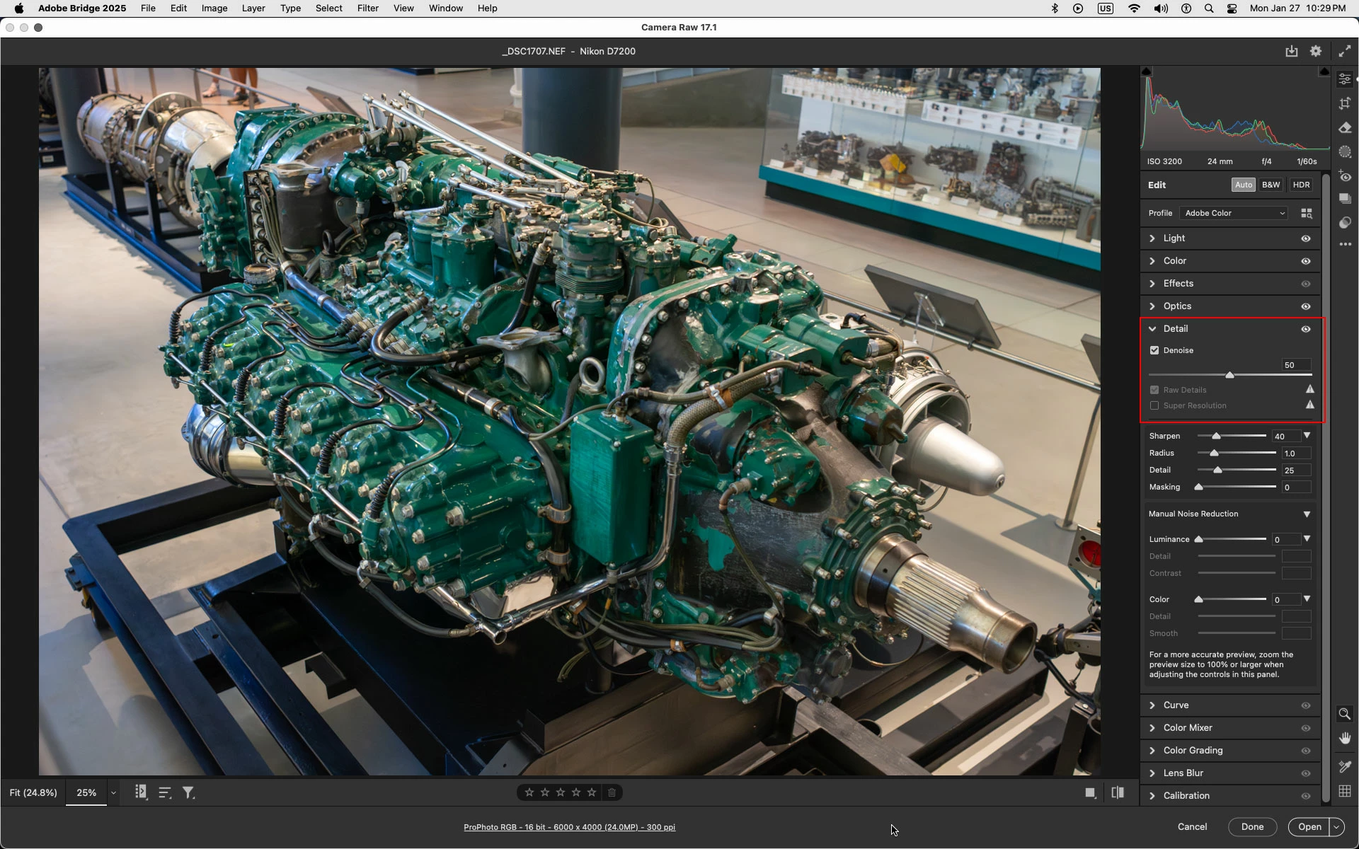 I updated to the latest Photoshop 2025 and Camera Raw. I was following a tutorial on new features with Camera Raw, but when I clicked 'detail', there was no option for Denoise (all the options to change each are there). In the tutorial instructions said after clicking 'detail' there should be an option for Denoise to click (auto denoise) was not there.