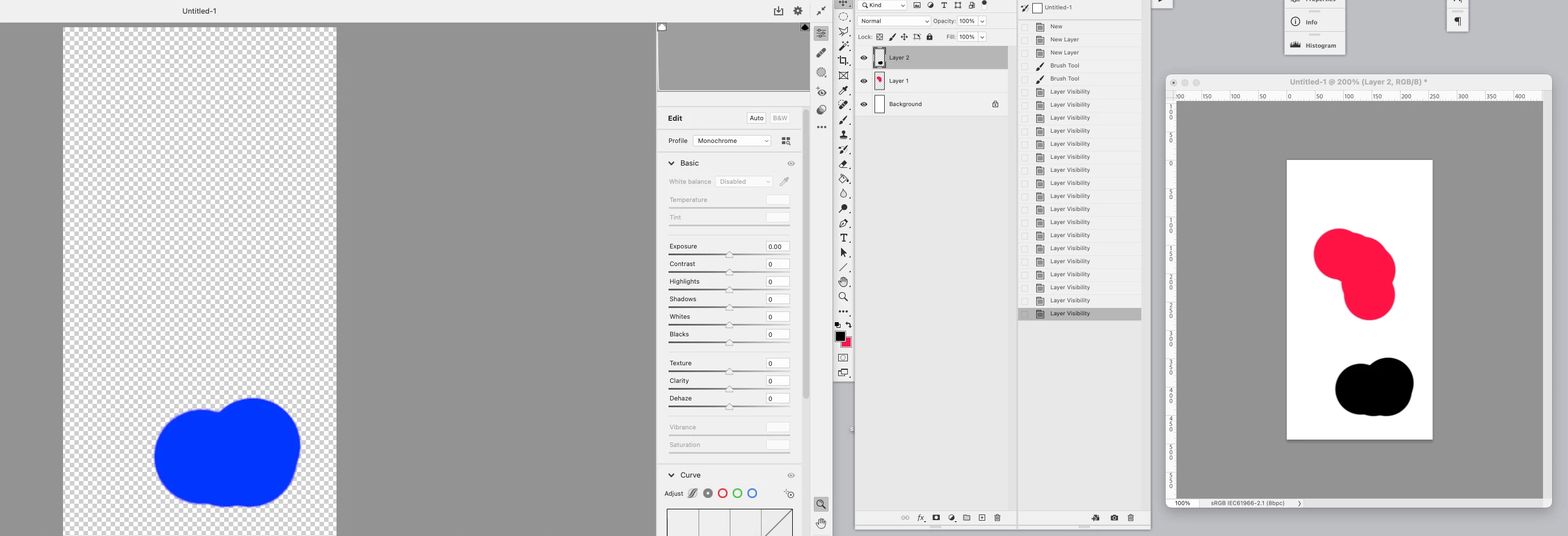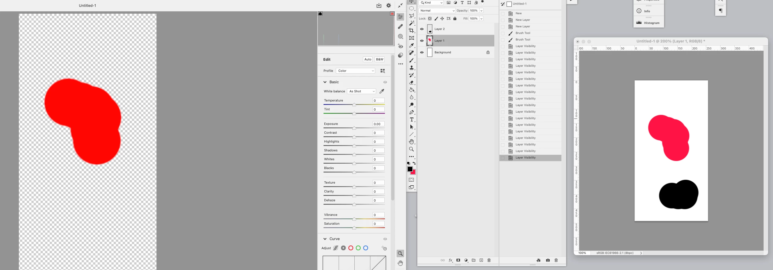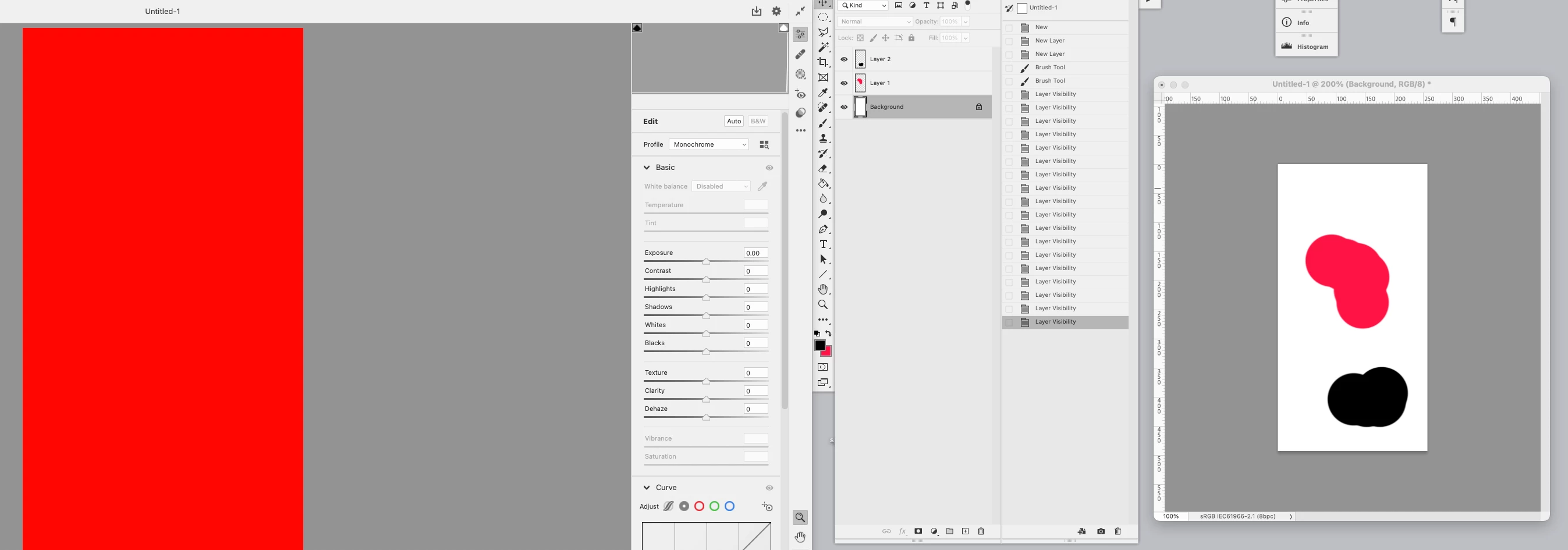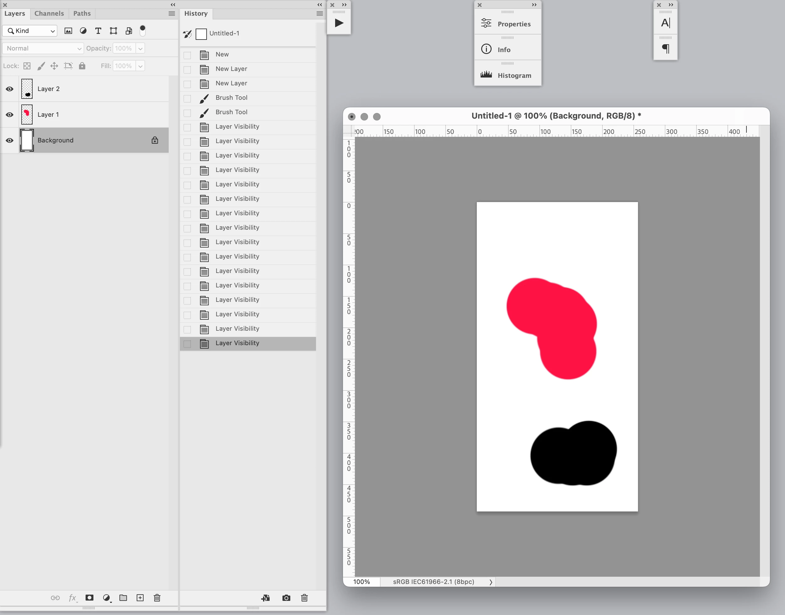 3. Leave background white. Use brush to paint a small area of Layer 1 red, and a small area of Layer 2 black.