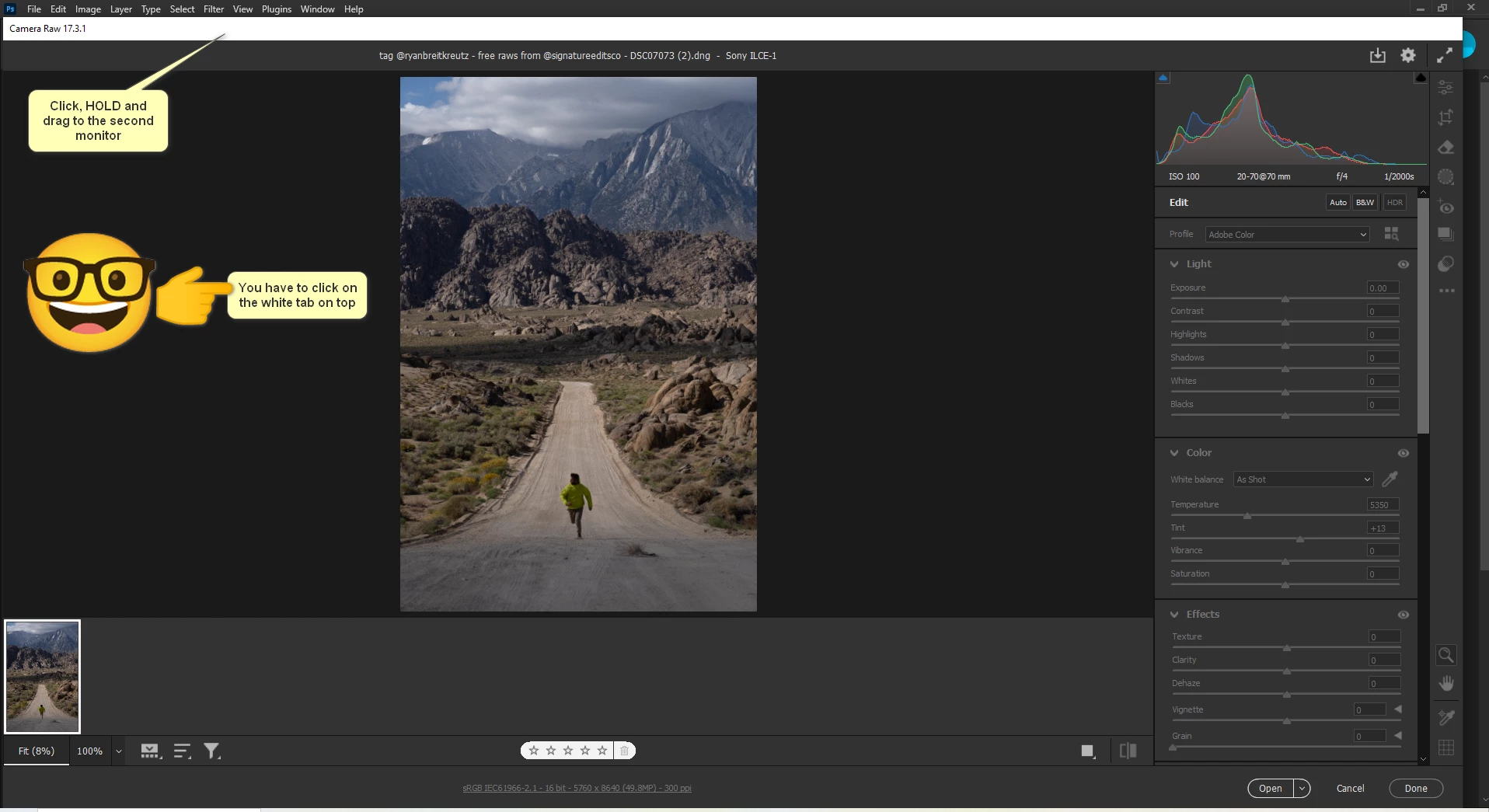 My problem is when a file is opened, it open Camera Raw on the laptop screen. There does not seem to be a method of moving it to the monitor. Its most annoying as the monitor is calibrated and the laptop screen isn't, so the images show colour differently