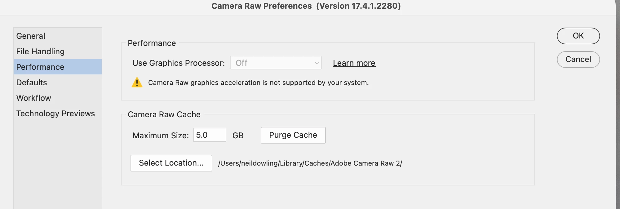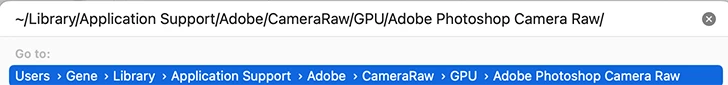 In the dialog that opens, type or select-copy-paste this path in: ~/Library/Application Support/Adobe/CameraRaw/GPU/Adobe Photoshop Camera Raw/ (That curvy dash is called a tilde and is shorthand for your User directory.) Press the Enter key.