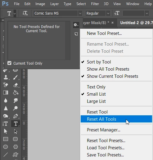 I am still using PhotoShop 5.0 and it has worked fine for me up until today, when I could not get the Tools feature to enter text into a project I am working on. Apparently I accidentally did something to cause this, as it has always worked fine previously. Can anyone suggest what I may have done to cause this problem?