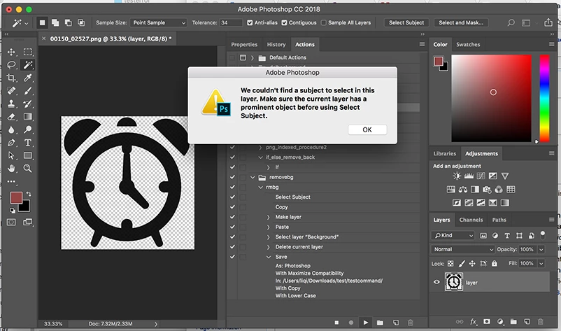 When I do "select subject" on an image, there is pop-up warning( showed as below ) and need to click it to continue the process. I use the batch to run a lot of images one time, this problem would disrupt my process and stop there until someone click it. Or is there any methods to mute all the pop-up warnings?