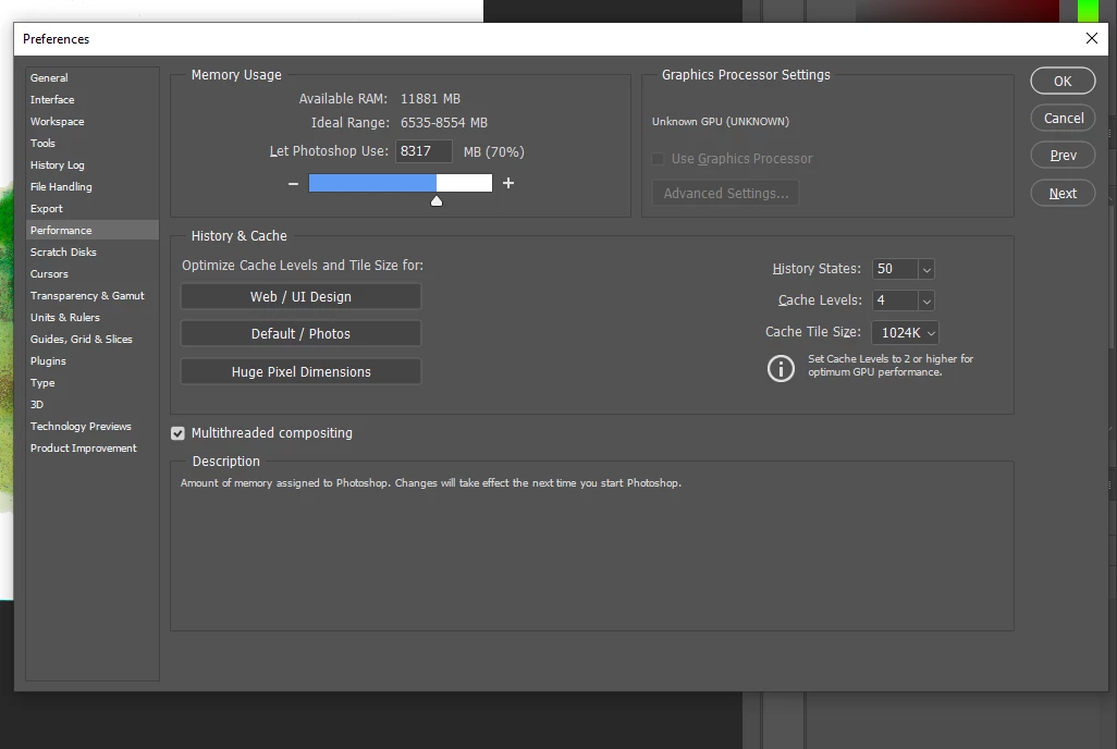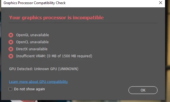 Make sure your computer meets the minimum CPU & GPU requirements to run Photoshop.