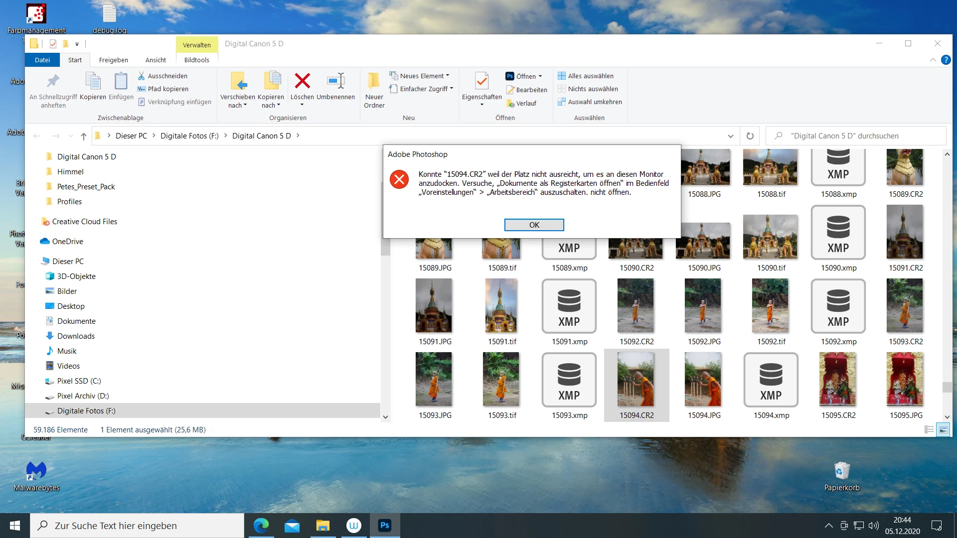Yesterday I suddenly couldn't open a RAW file in Photoshop, the following error message appeared: "Could not open 15094.CR2 because there is not enough space to dock it to this monitor. Try to switch off" Open documents as tabs "in the" Preferences / Workspace "panel." I got this error message for the first time. I've been using Photoshop every day for several months and the monitor, an EIZO CS 270, has been in operation for 2 years. Operating system: Windows 10. The PC is 6 months old old and specially built for image processing.