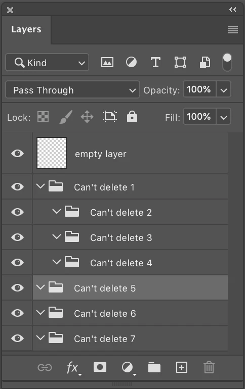• All of the layer groups cannot be deleted. (Note gray trash can in screen shot).