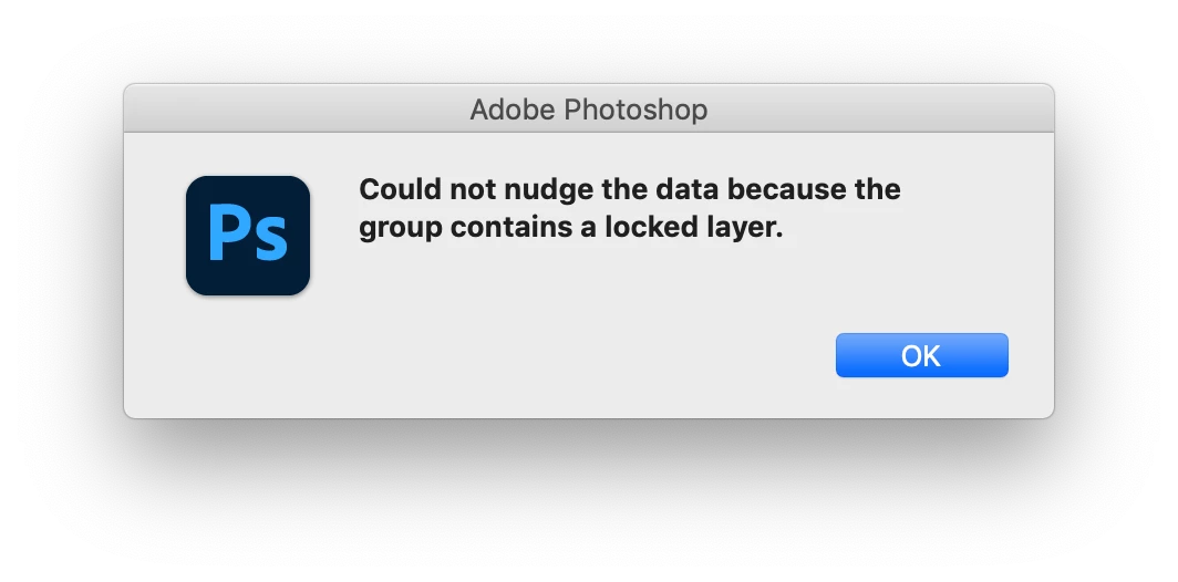 • For most of the layer groups, if you click on that layer group with the Move tool selected and click an arrow key you get the error message "Could not nudge the data because the group contains a locked layer." Of course, the group appears empty in PS. However if you select the bottom layer group you DO NOT get this message, yet that layer group also cannot be deleted.