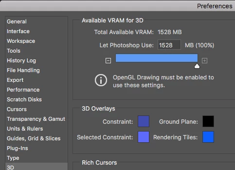 Photoshop has detected my GPU and I can go into the Advanced settings, I don't think Photoshop thinks my GPU is stuffed, but all of my 3D options are still greyed out except for "Get more Content"