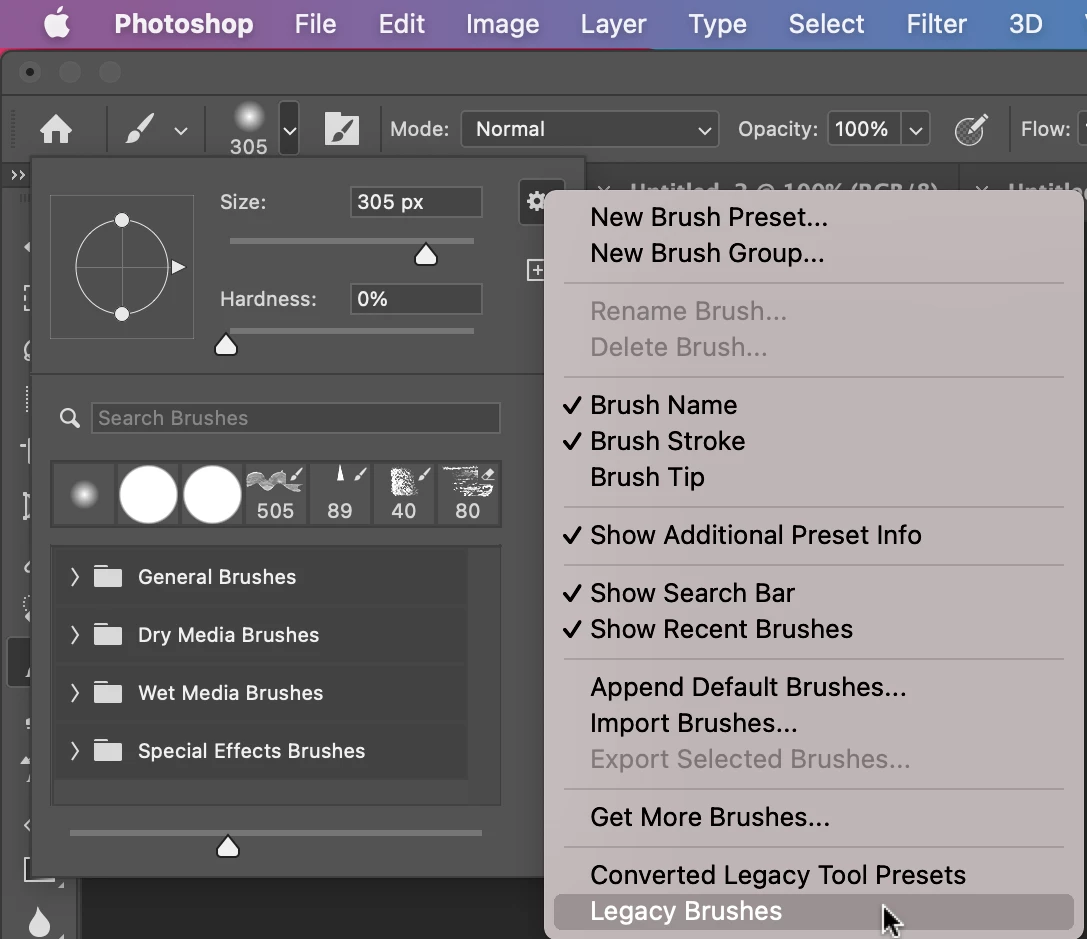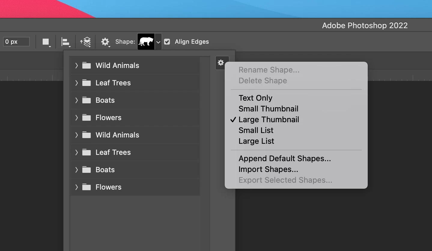 I recent began using Photoshop 2022. Under sustom shapes, I lonly get animals, flowers, etc. I see lots of references to this issue in here, and all say to go into the shapes menu, click the upper right and select legacy shapes. I don't have that option (see picture below) Is it because I now have the student version? Are they not available in this version?