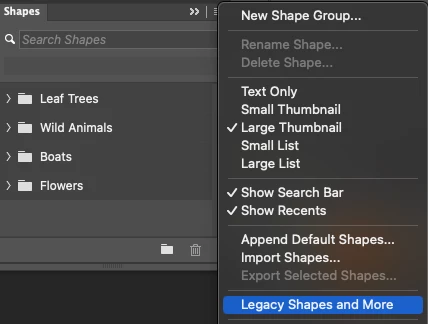 I just got Photoshop 2024 for the first time. I can't find the stars, hearts etc. When I choose custom shapes the dropdown menu shows only: animals / trees / boats and flowers.