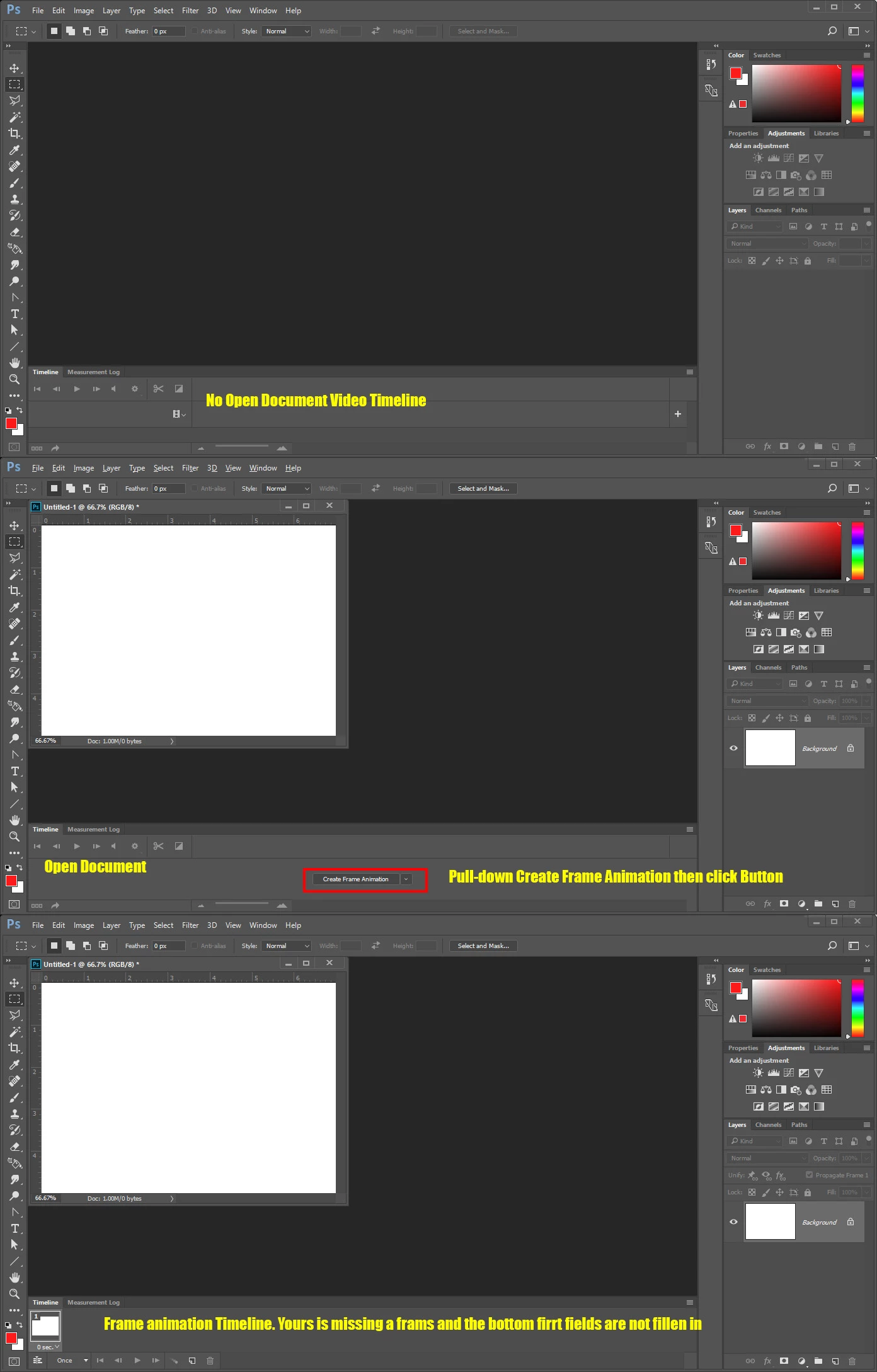 I've recently downloaded Photoshop cc and attempted to create animations by following tutorials online. But, I find that i do not have the "create frame animation" or the "create video timeline" buttons when i select "timeline" from the window tab. I'm not sure if this problem is related but whenever i try to animate, the same picture shows up in each frame and it doesn't "animate". (on a mac) Please help!