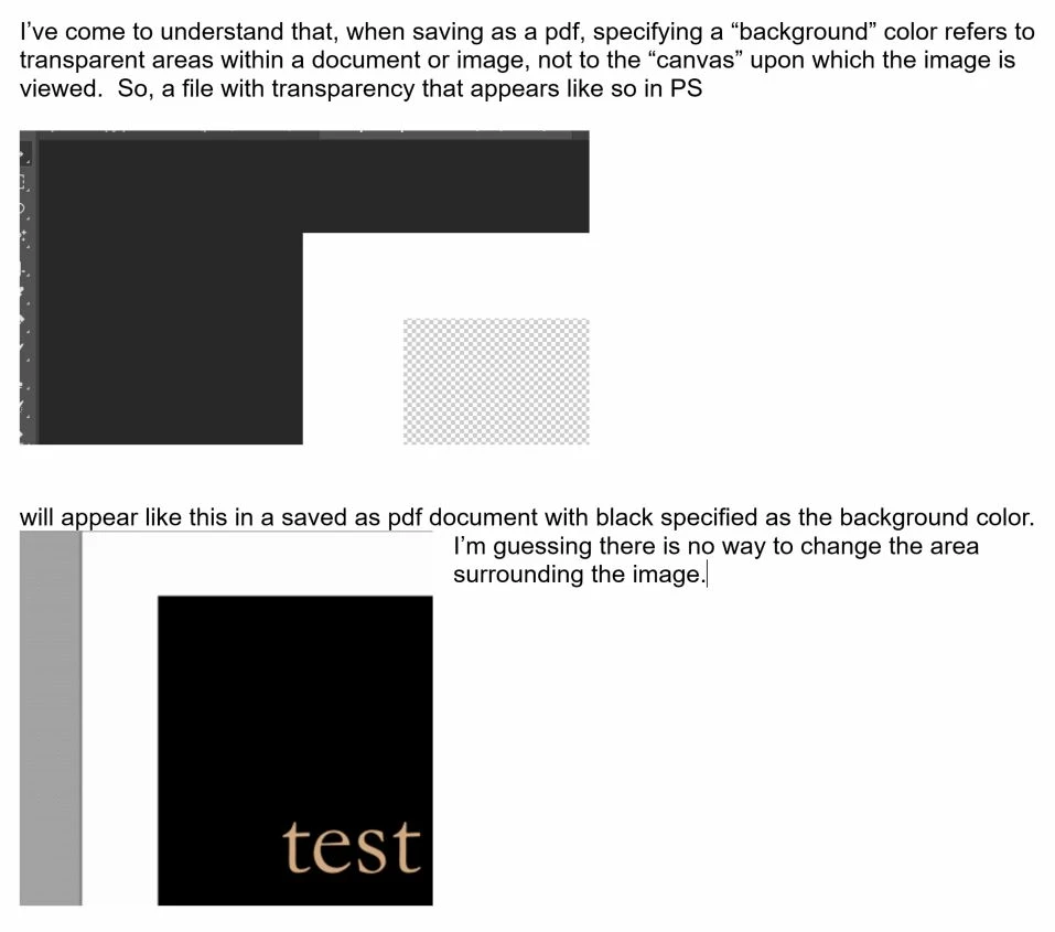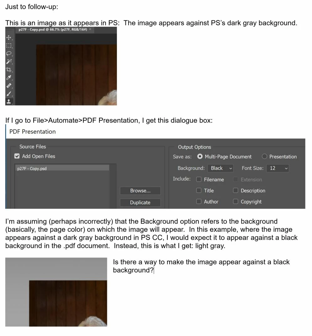 I want to put out a multi-page document in PS .pdf format. If I use "Save As," I don't get a choice of background color. If I use Automate>Multipage, I can choose a black background. However, I get a gray background. Anyone know how to get a black background?