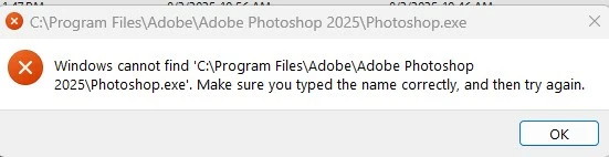 Can't open photos in Bridge or PS; msg. says Windows can't find PS 2025 exe