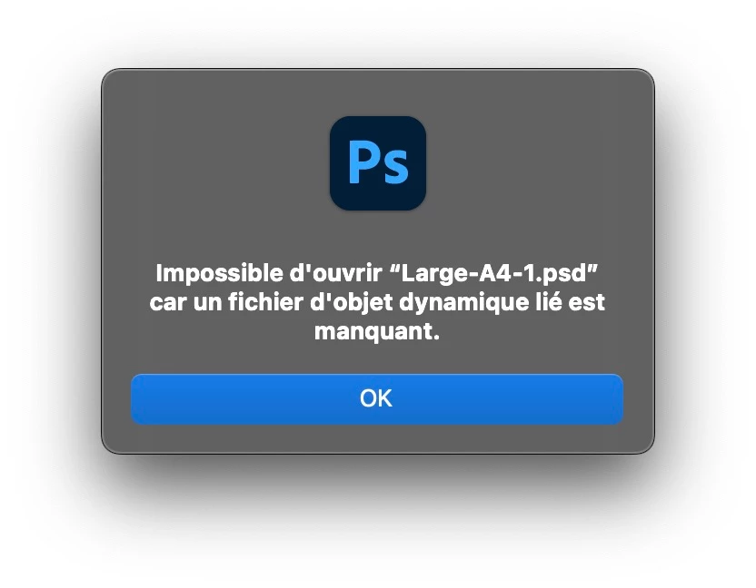 It's strange but I'm not able to open two files on Photoshop, when I try to open them it appears this message : “Impossible to open "file-name" because a dynamic link's file is missing" (French screenshot attached).