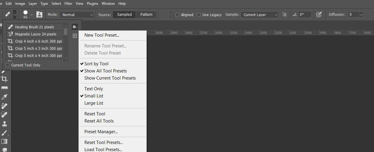 The paint brush can obviously use infinite different presets, but if you right click with the Healing Brush, there is no option to select a diferent preset. However, there are a number of things you can set in the Options Bar.