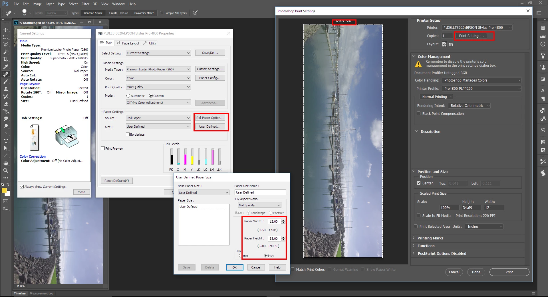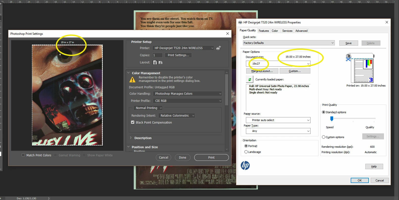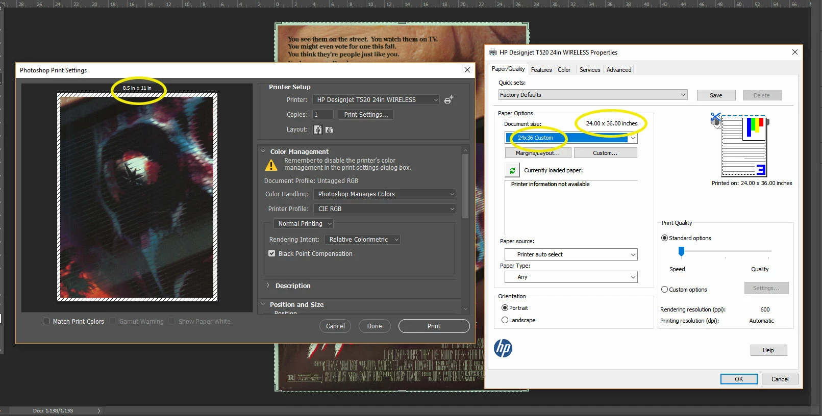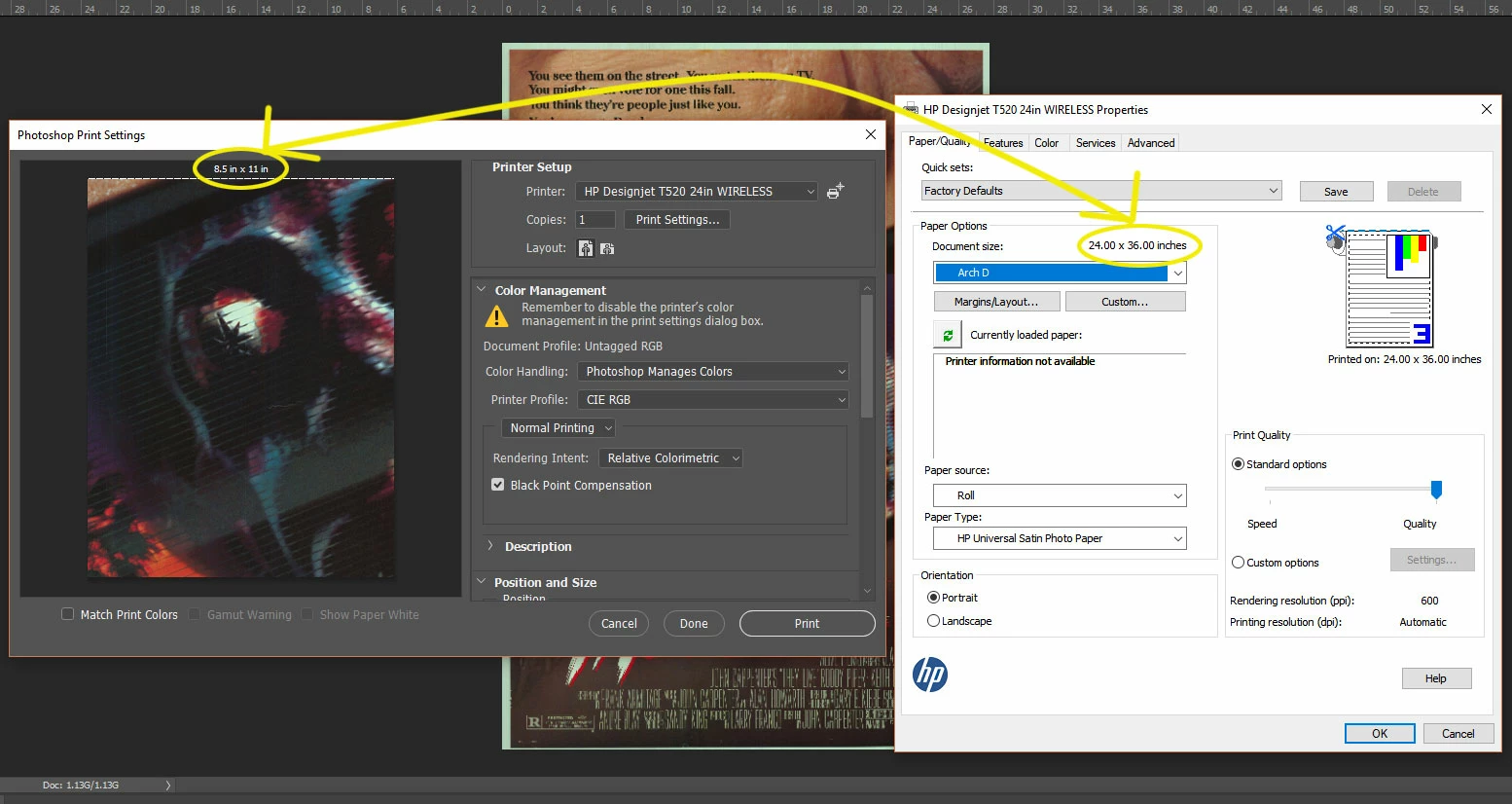 I can't print images bigger than 11x17 - or more precisely, i can only print on media up to but not including 12x18(ARCH B). No poster sizes, custom or preset sizes. for instance, when i try to create a 24x36 (ARCH D) poster, and print it from photoshop, the print dialogue resizes the media to 8.5x11. Anything ARCH B (12x18) or larger, and photoshop defaults to 8.5x11. 11.5x17.5? Sure. 12x18? hold on there, fella.