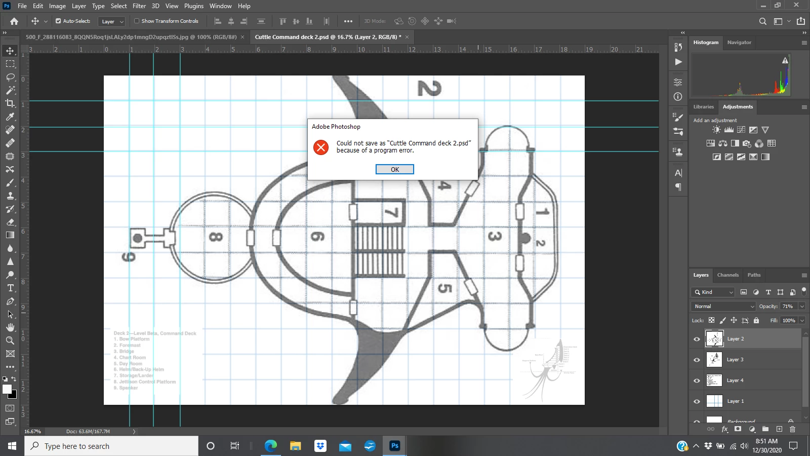 I open new (13x19 @11363214), build a grid layer for scale add 2 minor information layers, but when I copy the deckplan into a 4th layer, scale to grid, and rotate then go to save... I get error message. I've been trying to do work arounds and such for past week.