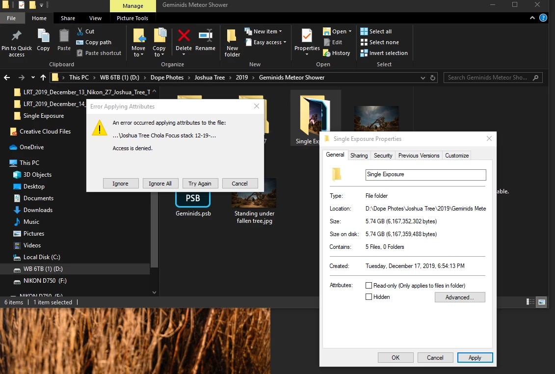 I have closed out of all other programs, including Lightroom Classic CC, but still receive this message. When going into the the file folder and clicking "Properties" I see that Read-only is checked. I uncheck it and hit "Apply" and receive this message" An error occured applying attributes to the file: 'File name"' ... Access is denied. I am the admin on this computer and have all permission checked for Allow: Full control, modify, read and execute, list folder contents, read, write. I've tried clicking on the parent folder and enable full permission and get the same error. Please help!