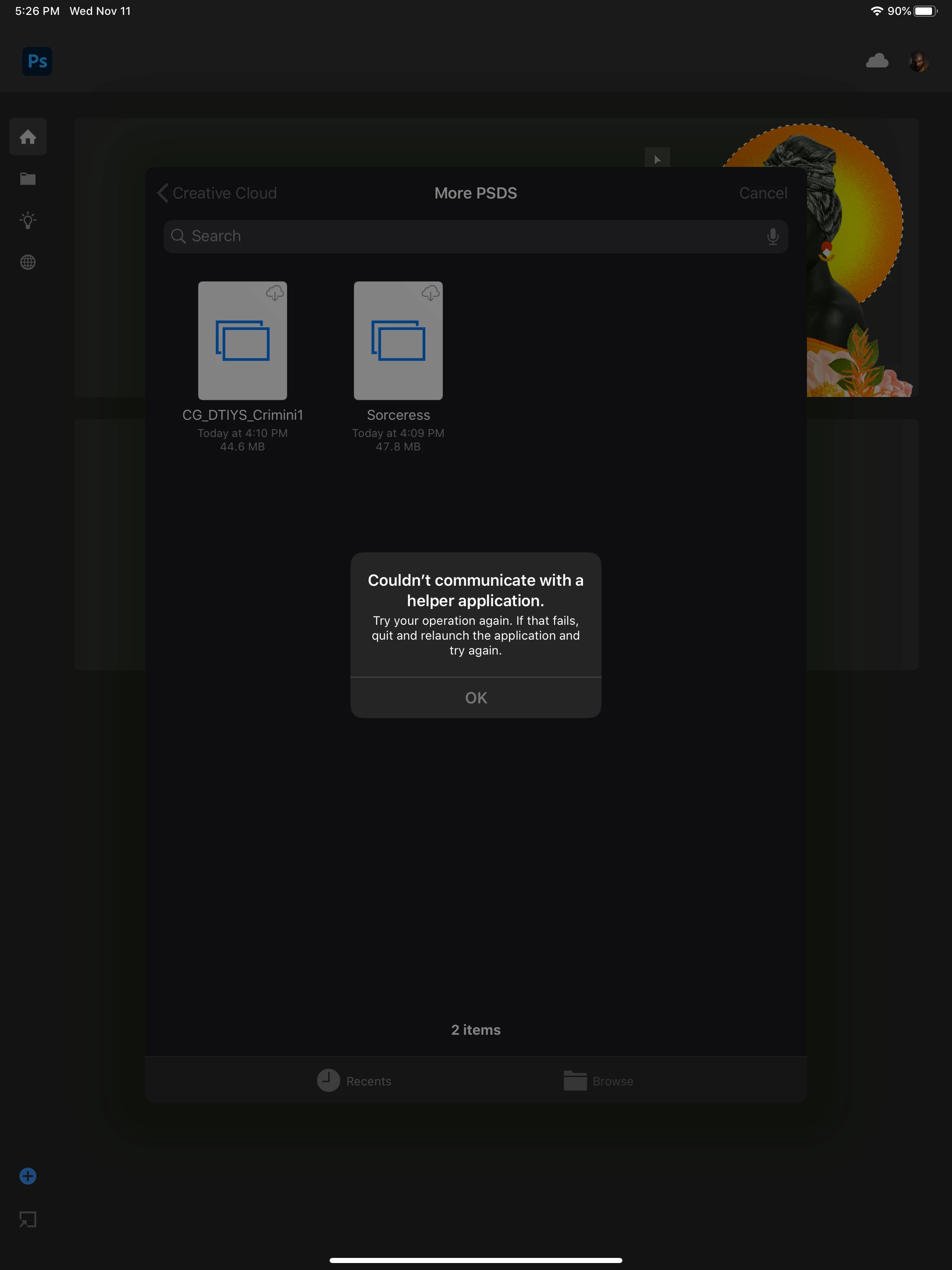 ZZionic_ArtsParticipantForum|Forum|5 years agoNovember 11, 2020QuestionCan't sync files from computer to ipadForum|Forum|5 years agoNovember 11, 20201 reply155 viewsRecently when I'm trying to sync files from my computer to my iPad, my mobile version of photoshop gives an error when I try to open the file. The error says that it can't communicate with the helper application. Can somebody help?MacProblem or error