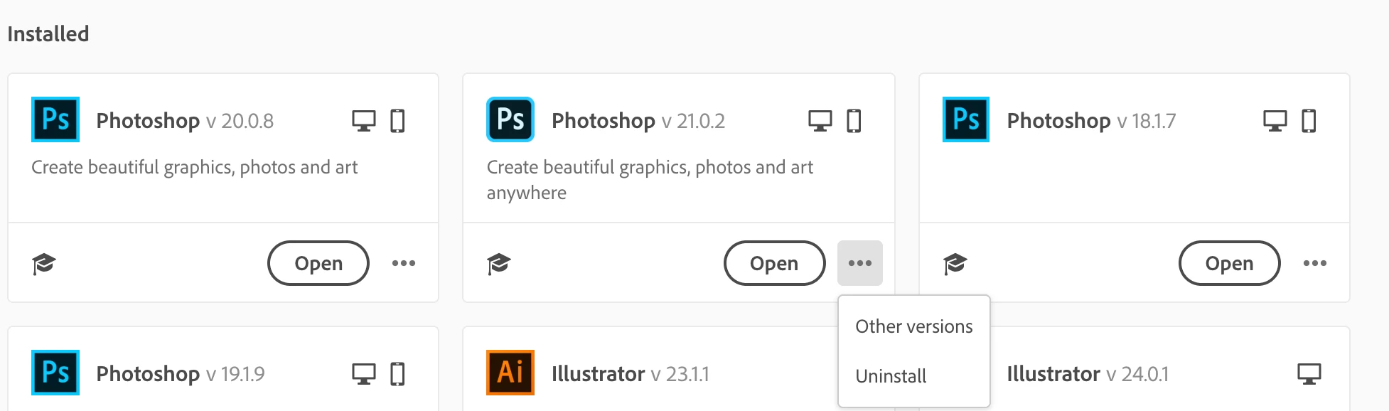 Open the Creative Cloud app > click the ellipses > Choose Uninstall.