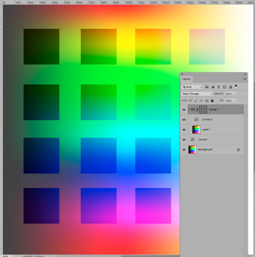 I now want to make final image corrections to these 117 jpeg files in Photoshop 2020. By far the most effective method is to make two separate adjustments; one for the actual images and another for the slide mounts (the slide mounts contain a lot of useful information, including a unique ID number I stamped on each of them). This requires me to start by creating a set of 20 selection marquees for the images (some of which are in portrait mode). After applying a curves adjustment to the images I then invert the selection and do another curves adjustment for the slide mounts.