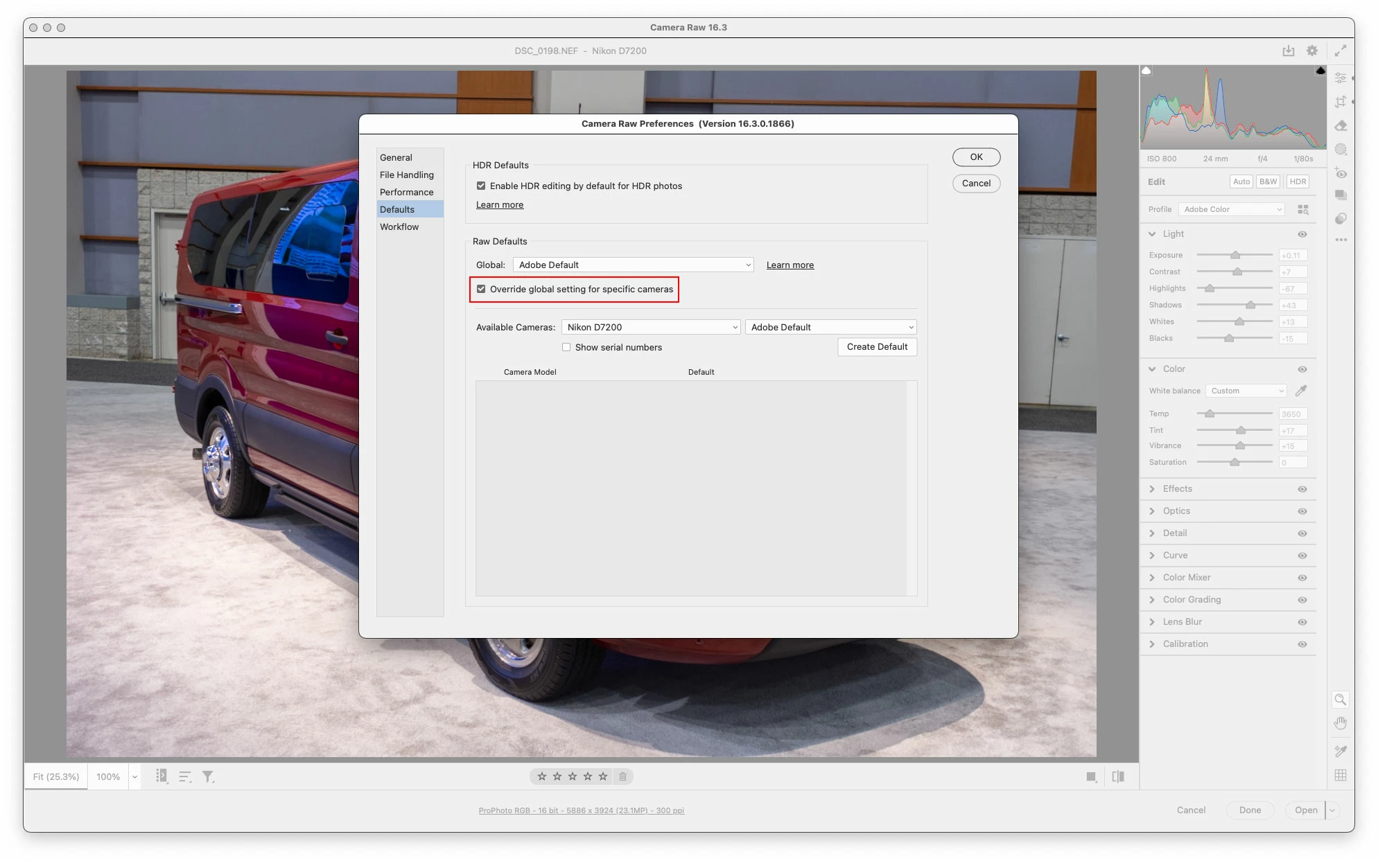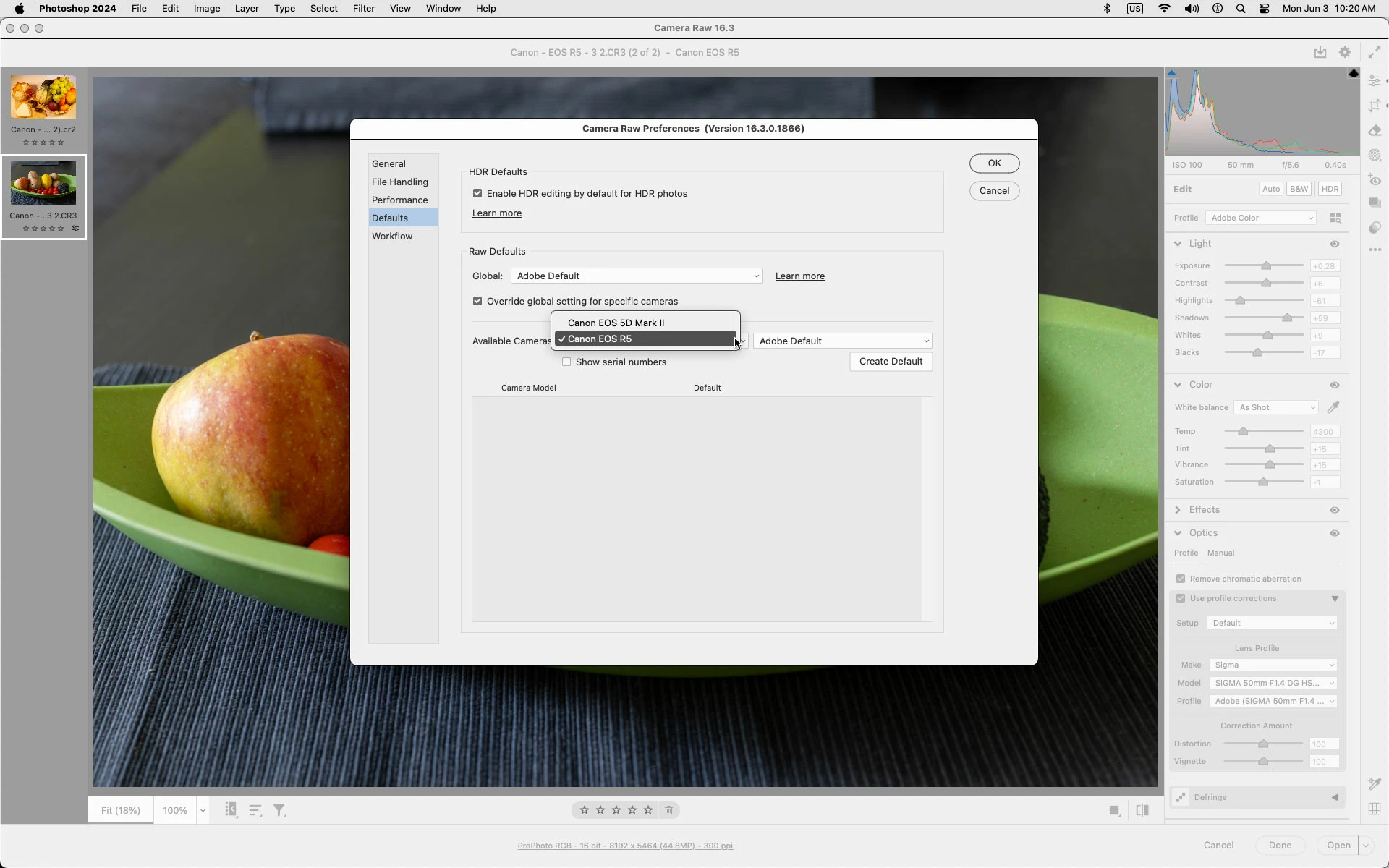 I'm unable to add/select a camera in ACR preferences defaults. "Available cameras" is greyed out.