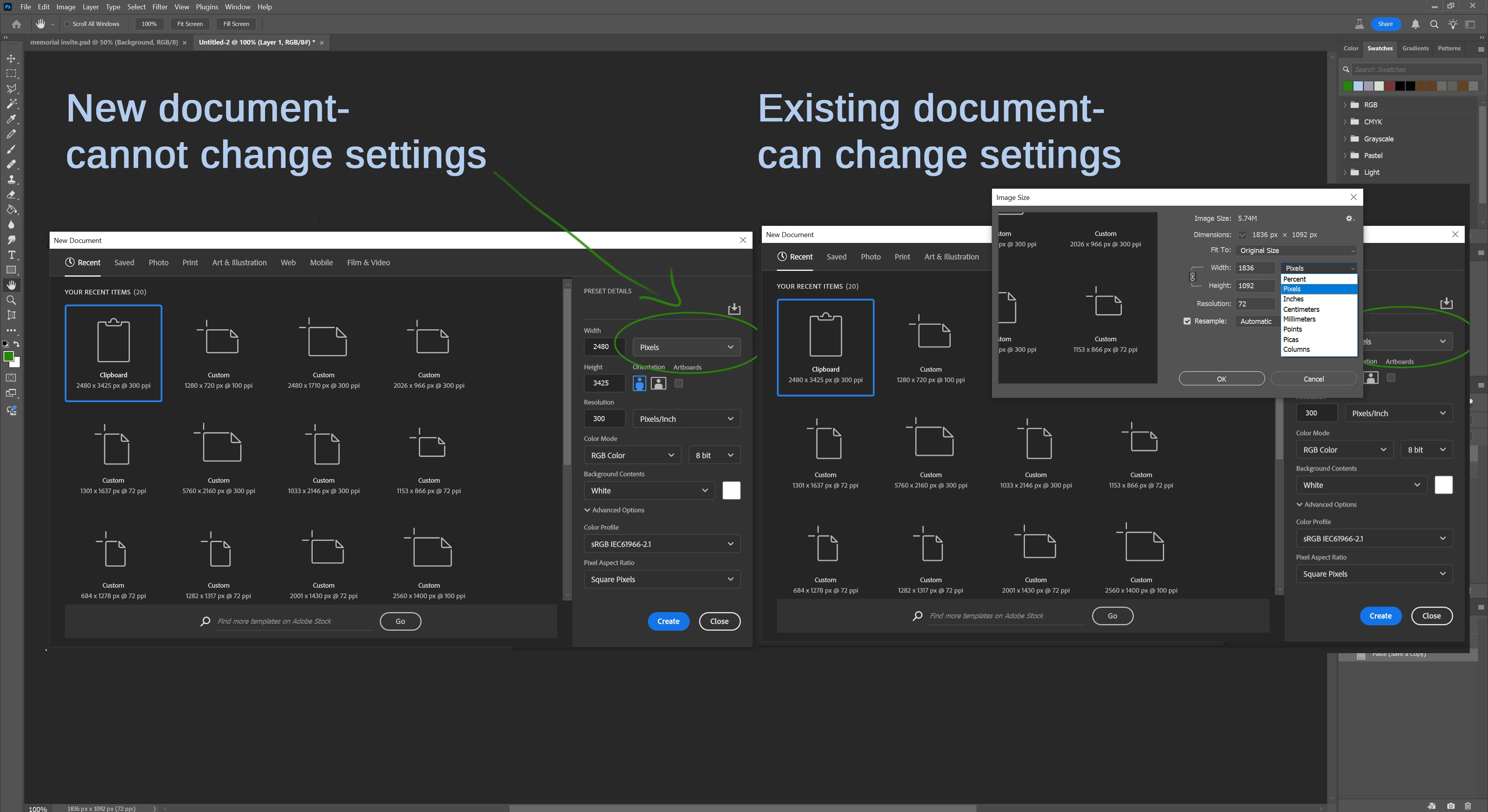 I cannot change the setting for whether I want to work in pixels, millimetres or other when creating a new photoshop document (left), but can with an existing document (right). I can change size and resolution but not the format.