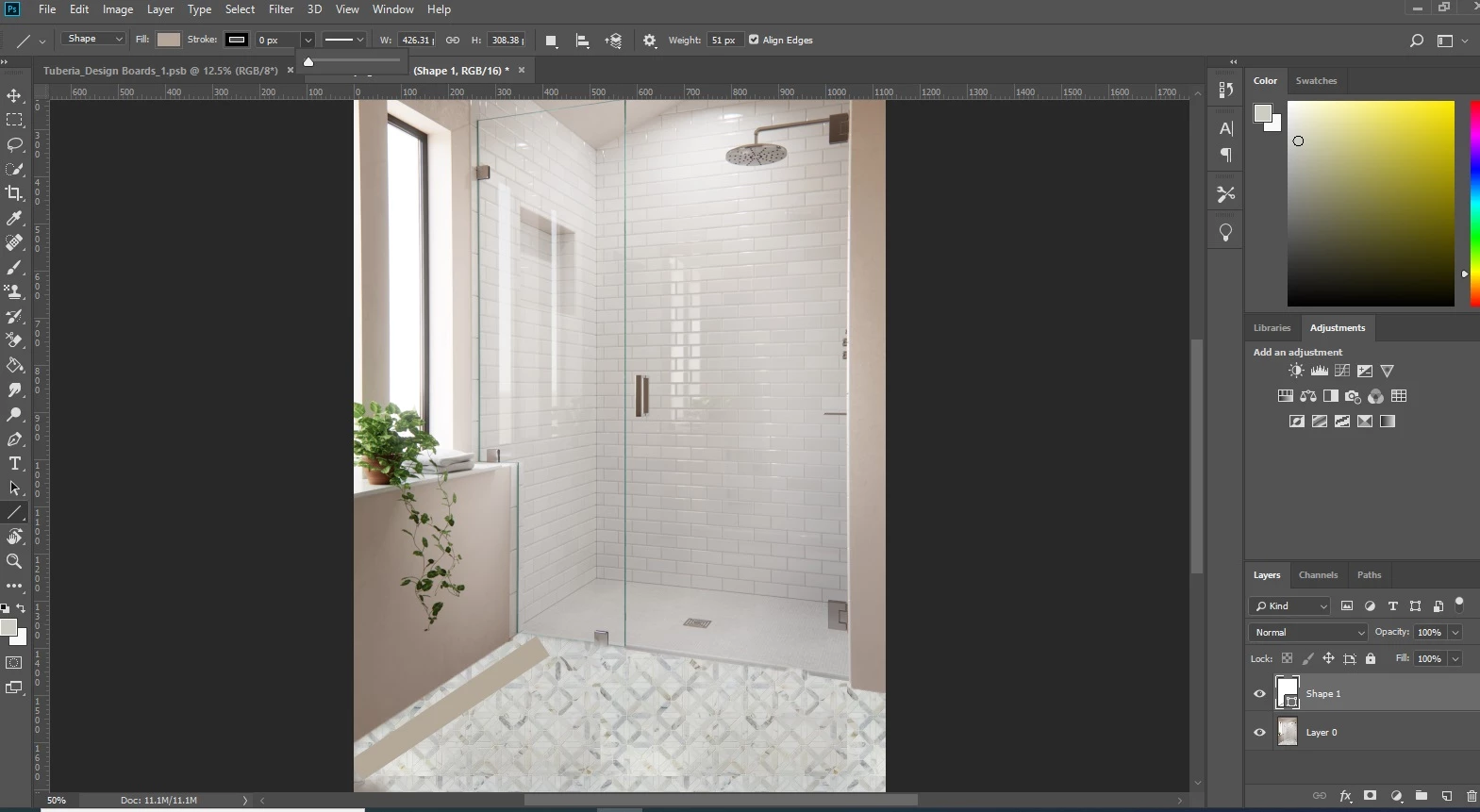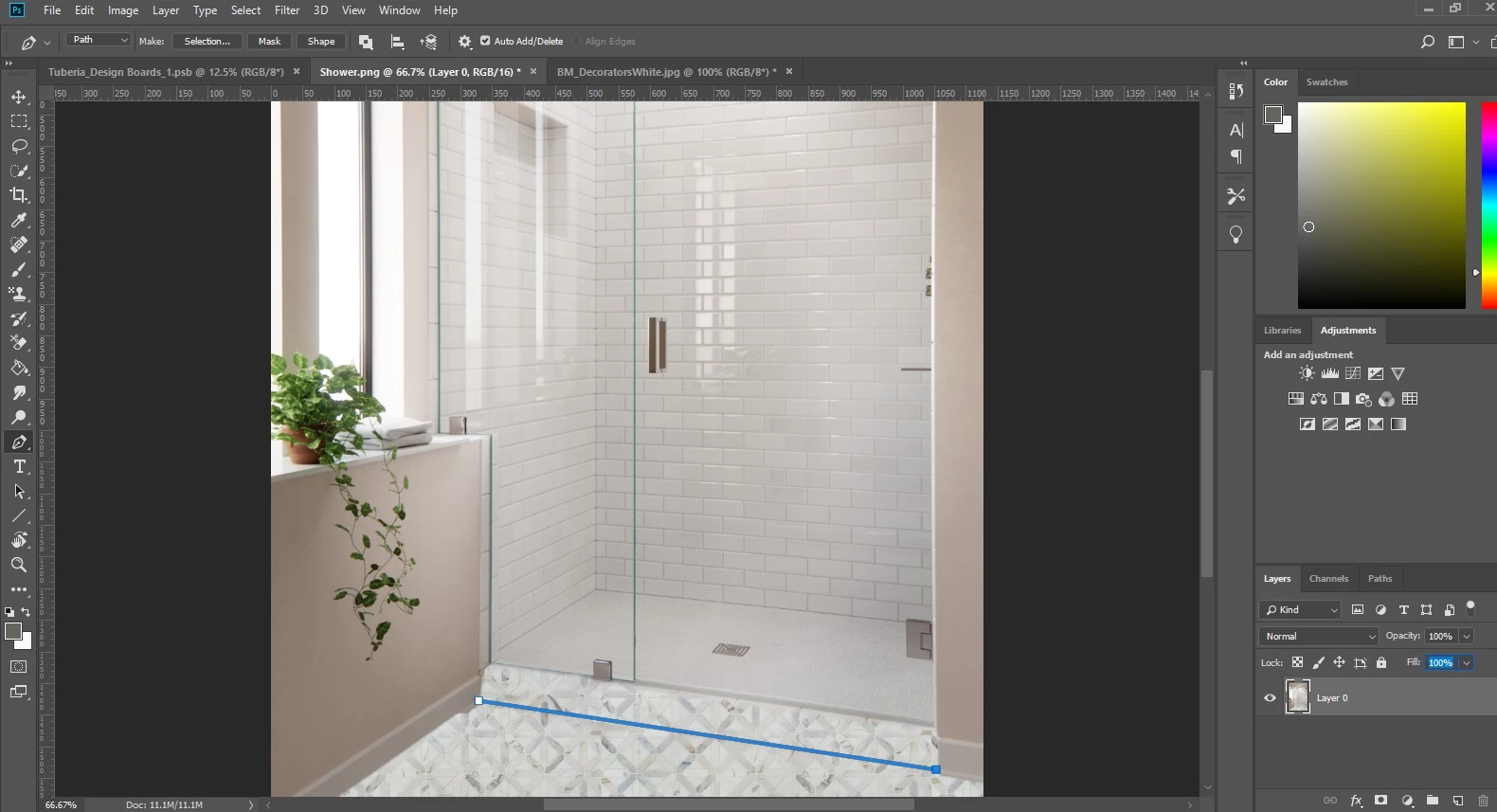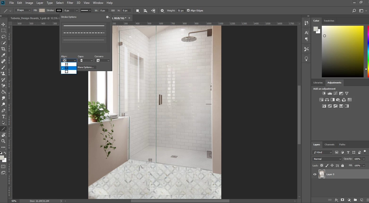 I cannot believe how difficult Photoshop makes it to draw a simple straight line and then adjust the line weight. In the attached screenshot, I am simply trying to draw a line where the baseboard meets the floor to distinguish the adjacent materials after I have applied a tile pattern.