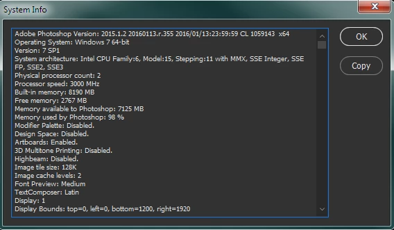 My preferences detail is exactly the same as yours while the first line of the system info is: Adobe Photoshop Version: 2015.5.0 20160603.r.88 2016/06/03:23:00:00 CL 1078833 x64