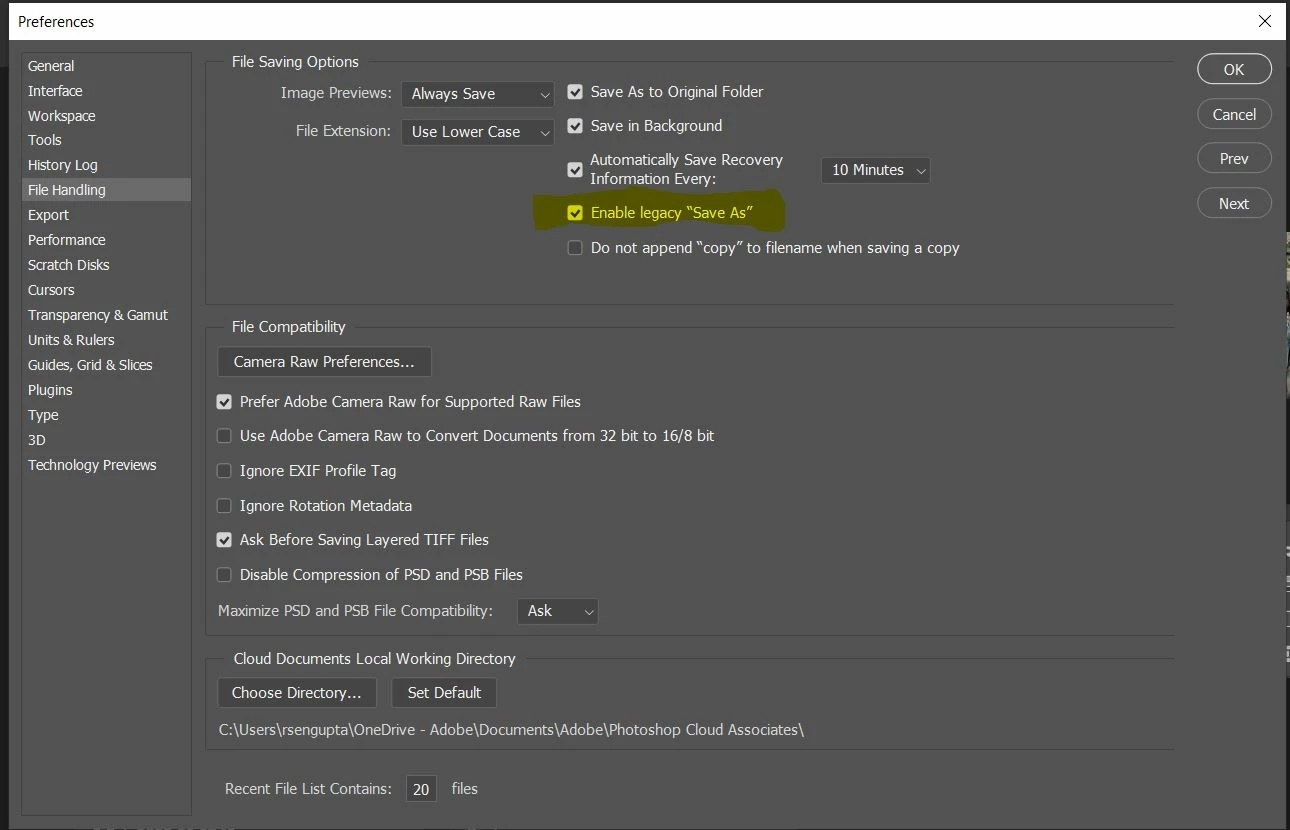 Go to Edit> Preferences>  File handling> "enable (Legacy Save As)."