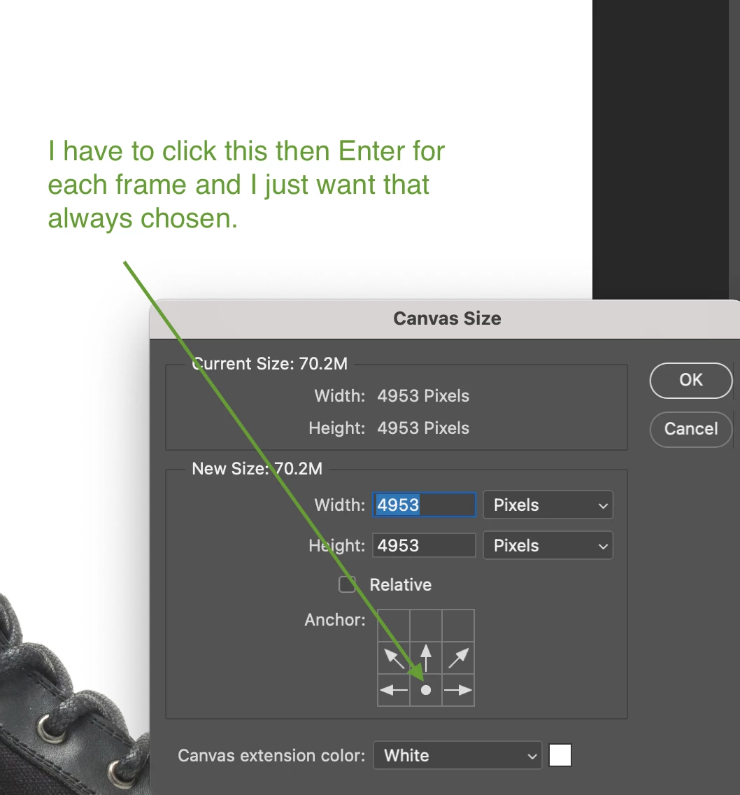 I have a super simple script that reads the canvas size from the first opened document, then applies it to the following opened docs.  I'm using Bridge> Tools> Photoshop> Batch to open multiple files and run some parts of an action, then apply the canvas size from that first image.  Everything works well except I have to press MiddleBottom button and entere for each frame.  That renders the script pretty much useless for me since I'm running tons of files through it.  Anyone have a clue on how to have it apply the crop bottom middle up (i want my image to remain at the bottom of the canvas).