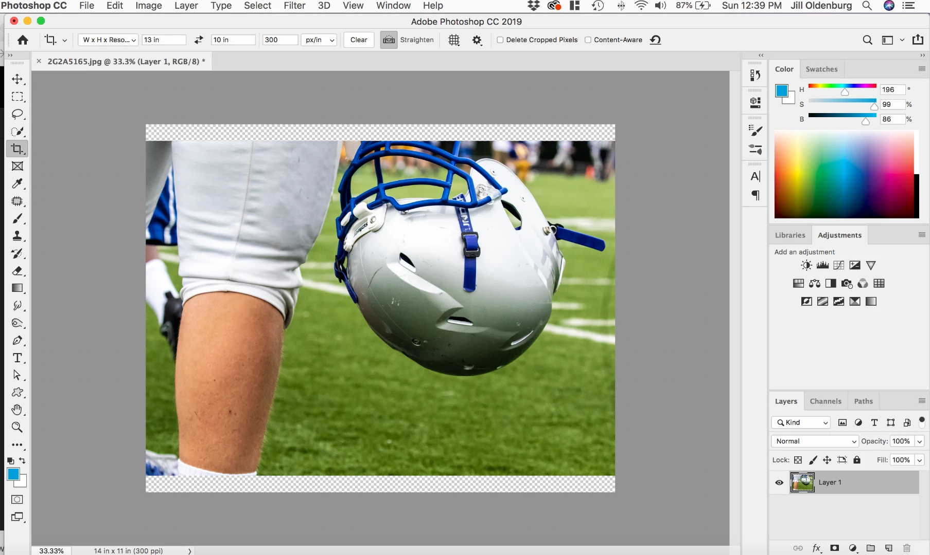 PS beginner, working on CC'19 and I don't understand the how to size the canvas size to 14x11 inches and the image size to 13x10 inches so I can make a border. My jpg is roughly 6x9", 600ppi so first I resampled it to 16.5x11inches, 300ppi. Then I adjusted canvas size to 14x11" and then cropped to 13x10 but that left me with this. It appears that the canvas size is 14x11 and the crop worked to be 13x10 so why isn't there a one inch border on the right and left? Any help is appreciated, I'm truly not 'getting' something here and even after reading forums I can't wrap my head around how to do this. Thank you!