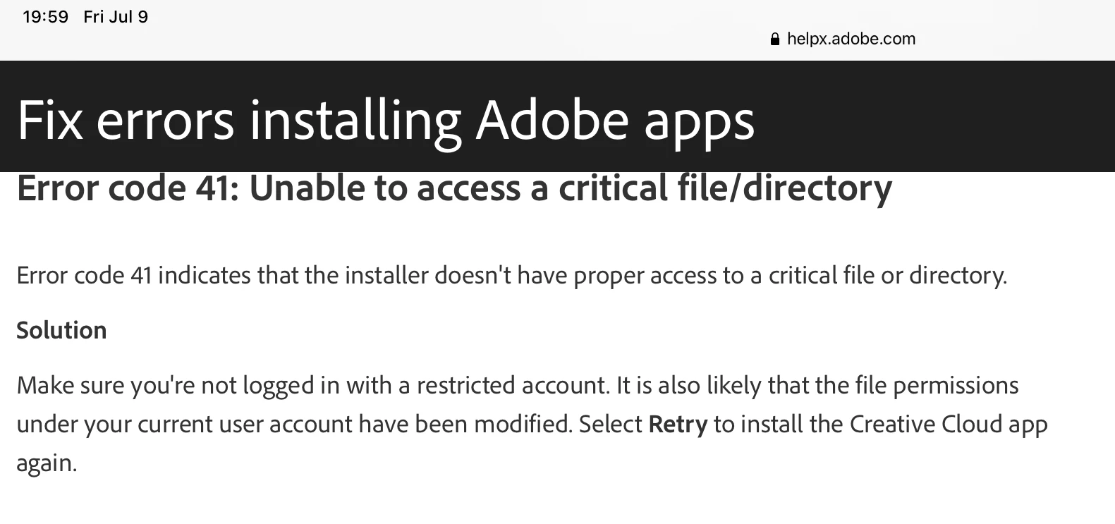 Make sure you're not logged in with a restricted account. It is also likely that the file permissions under your current user account have been modified. Select Retry to install the Creative Cloud app again.
