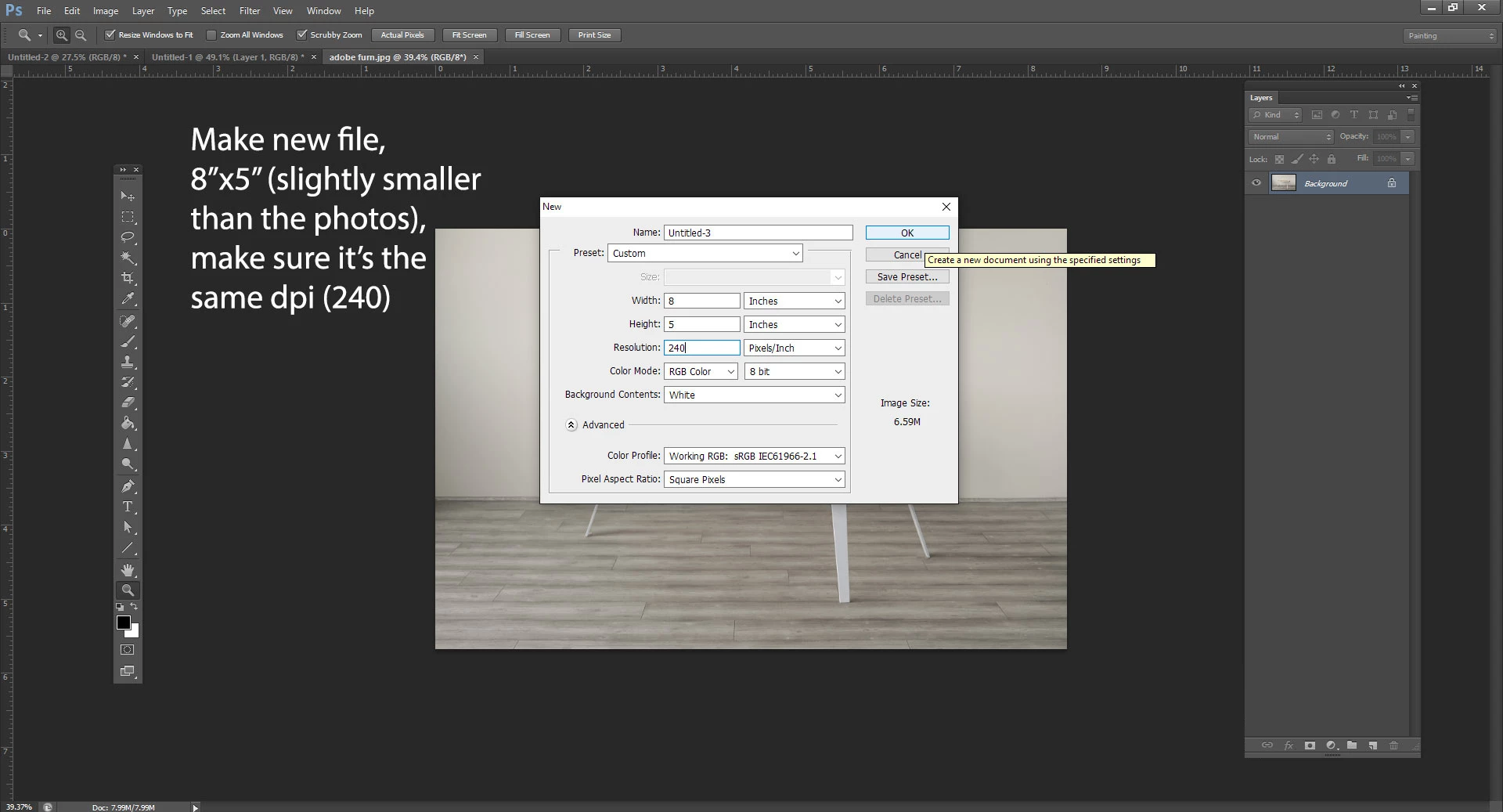 Here, I made a canvas 5" wide (because my photos are tiny) and positioned the guides accordingly:
