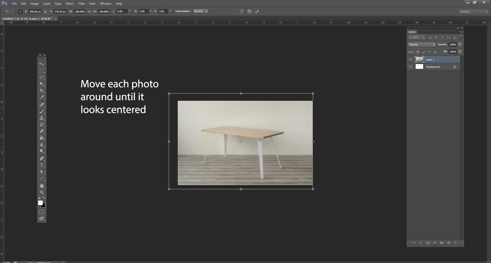 Hello: I am attempting to crop photos so that the product (furniture) is centered within the photo and uniform across all photos - there is no clear centerpoint on the furniture. The products photos are nearly idential but I would like to make sure they are idential.