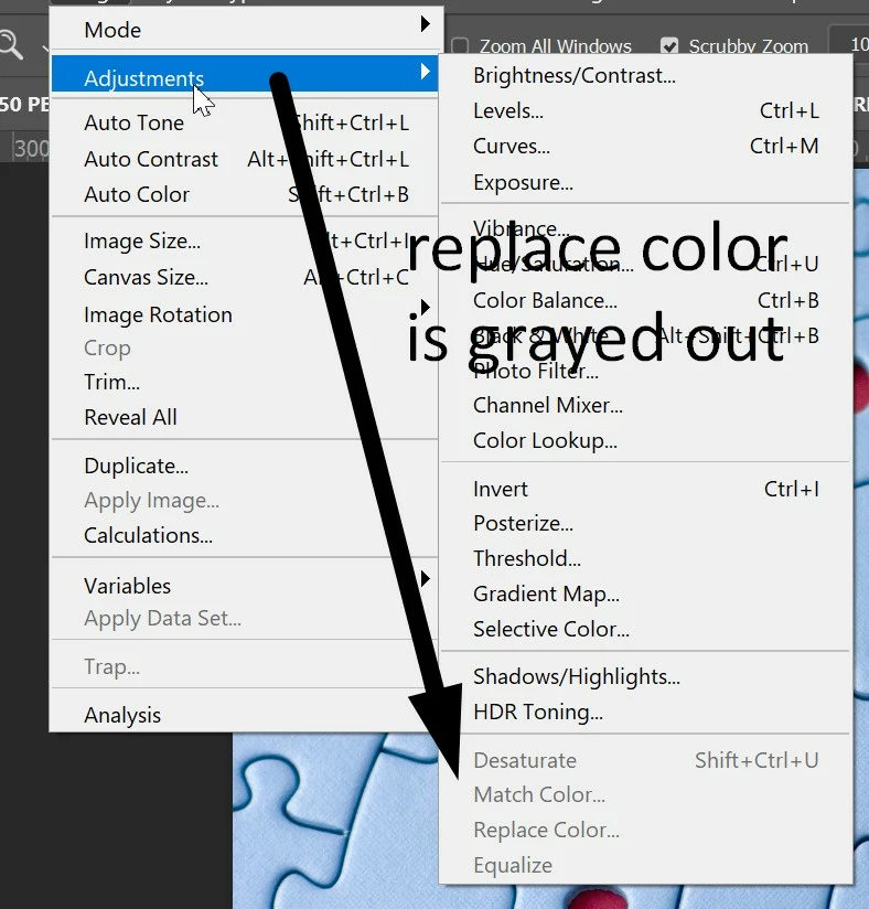 I want to change the color in an image but it is grayed out as an option. How do I access it.