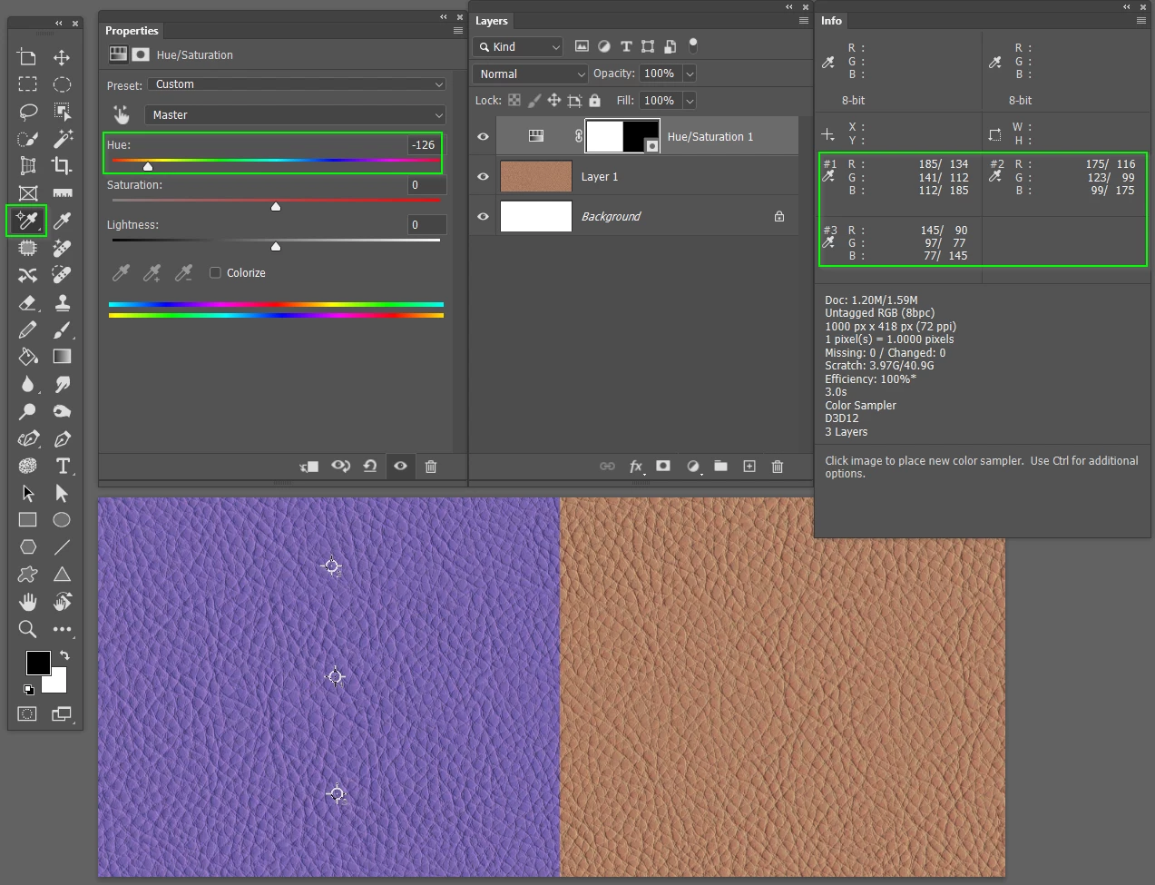 We build leather products.  We ofer a lot of different colors of leather and do not always have time to build a demo in each color.  Better leather has more variation within each leather color, so it is not accurate to just repalce the RGB value.  Is there a way to get a mask of another leather color and repalce the source leather color with another leather color?
