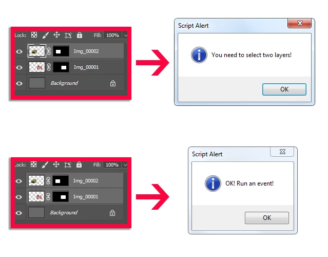 I just need to know if two layers are selected, if true, a scpit will be executed, if not; that there is an alert message and do nothing.