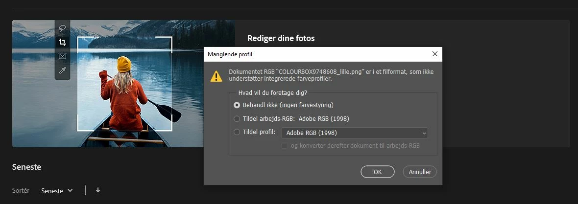 I hope you can help me figure out how to work around the photoshop color setting options, that appear when importing a photo with an embedded color setting. It only presents a challenge, when I want to resize an entire batch of pictures automatically and don't necessarily want to press "use intergrated color profil" for a thousand files.
