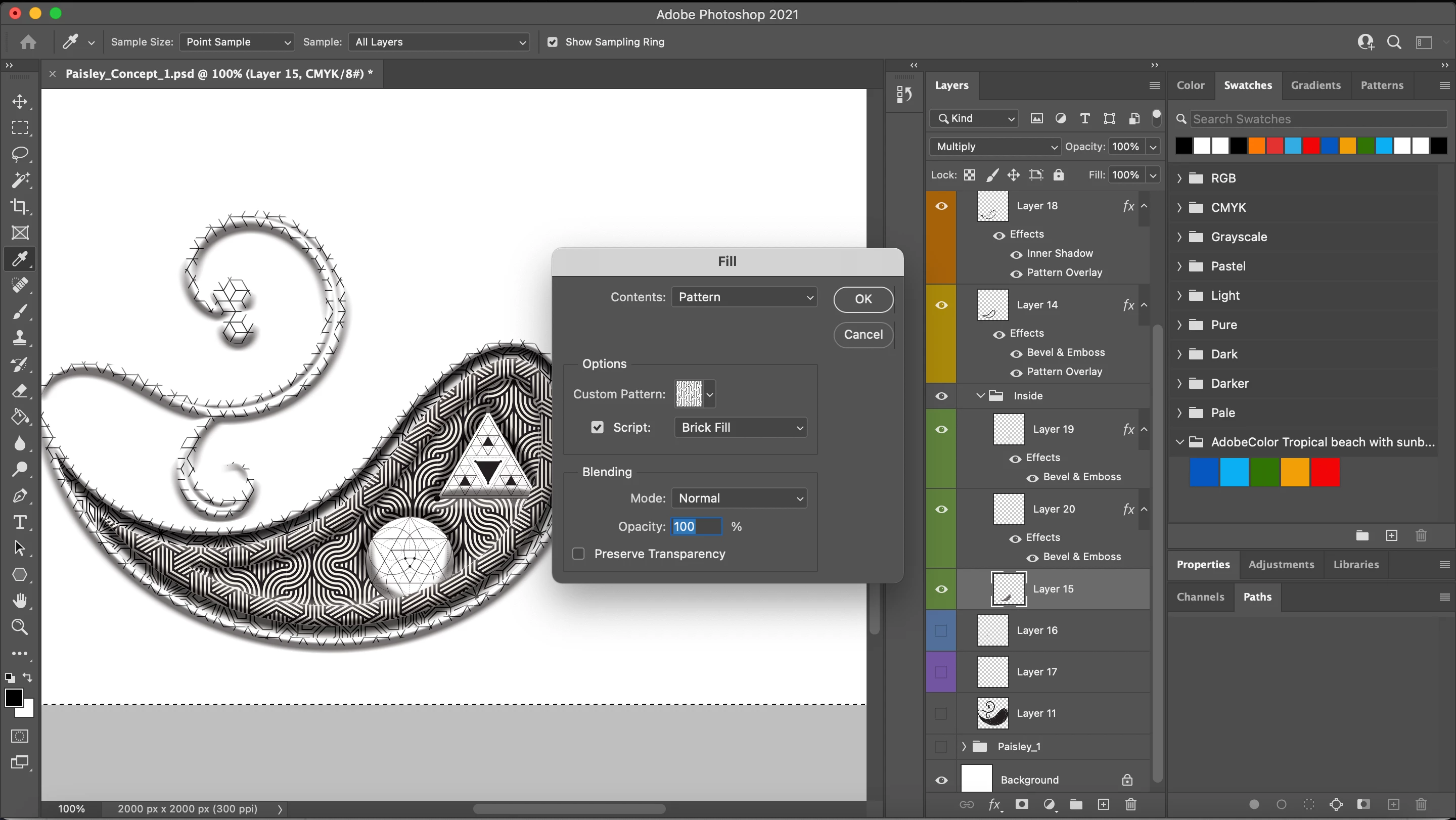 My preferred process is to build most of my artwork in Illustrator, and colour the “bits” in shades of grey. This helps me focus on the layout and not get too wrapped in the colour scheme. Once I have that figured out I’ll export the layers to Photoshop. Most of the colouring in Photoshop I’ll do with a colour overlay applied in a layer effect. I find it more efficient than manually selecting, and re-colouring, each component.