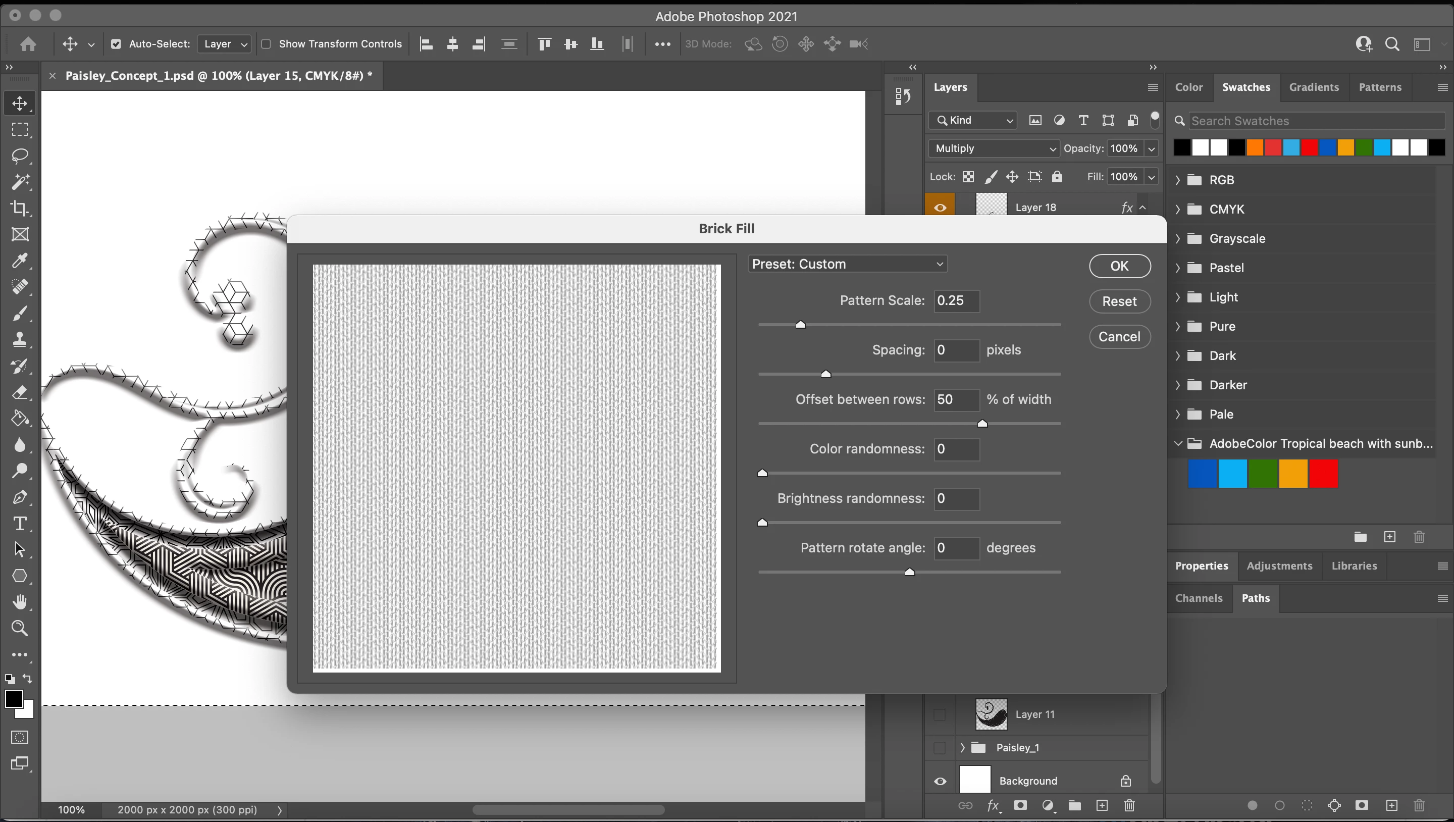Shift Delete.  Pattern Fill.  Select the type of fill, which is beneath the Custom Pattern selector.  A diologue box will appear asking you about how you want the pattern.